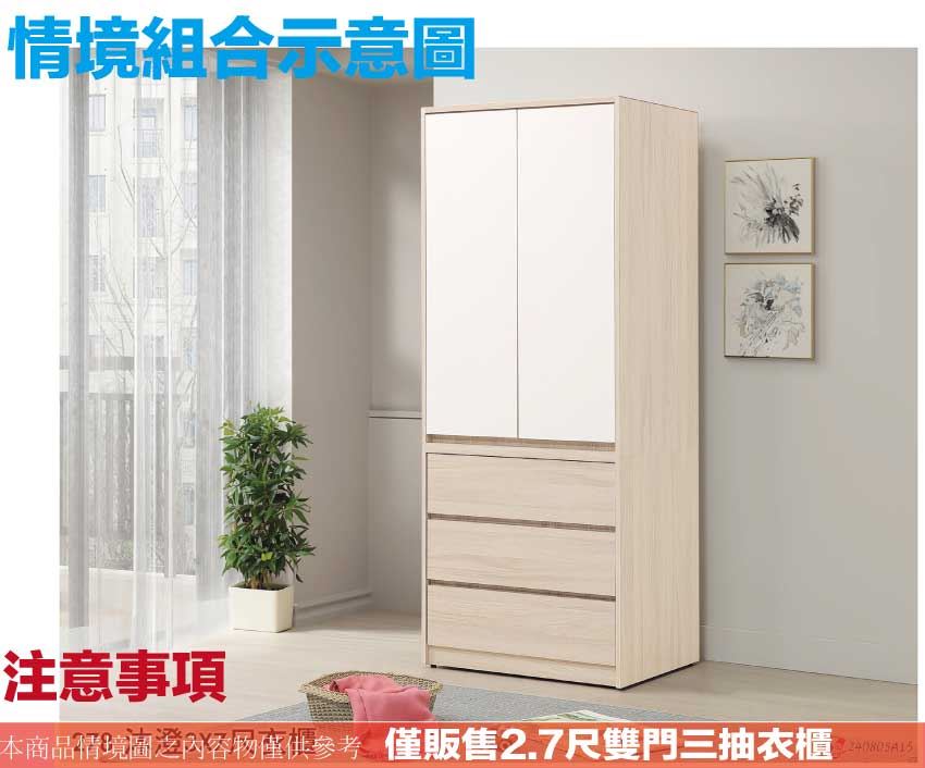 ★偏遠地區需額外加收運費,下標請先問與答詢問★ ★下訂前注意 由於商品流動較快,下訂前請先詢問是否有貨在下訂喔~★ 【綠家居】山多利雙色2.7尺二門三抽衣櫃 木紋雙色系+安心材質製造,使用放心+搭配居家更便利,採用防蛀木心板+防潮耐磨底座+五金滑軌結構+防夾手緩衝五金等安心材質製造 ,外層採用防潮耐磨噴漆處理搭配採用開門櫃+吊衣桿+三抽屜+內開放式層格等收納空間設計,全由專人配送到家,專業安心服務,替你省下更多時間!