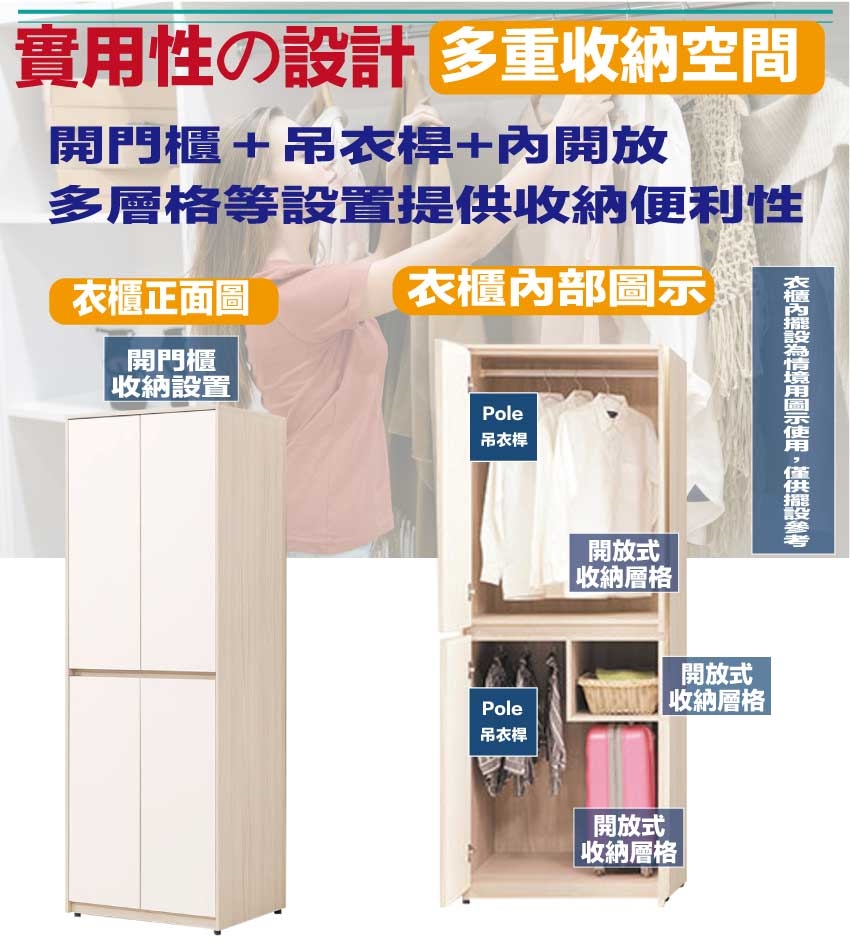 搭配採用開門櫃+吊衣桿+內開放式層格等收納空間設計