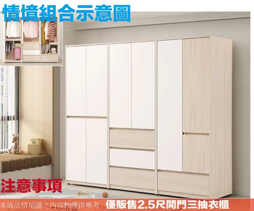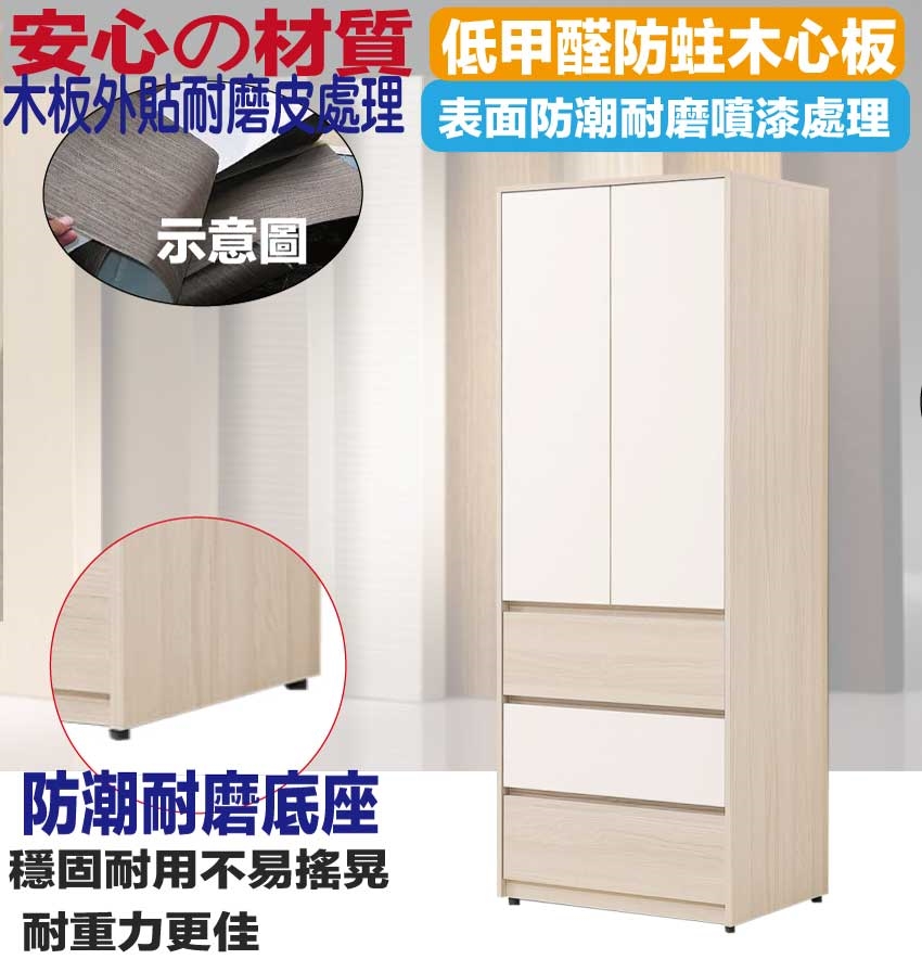 ★偏遠地區需額外加收運費,下標請先問與答詢問★ ★下訂前注意 由於商品流動較快,下訂前請先詢問是否有貨在下訂喔~★ 【綠家居】山多利2.5尺二門三抽雙色衣櫃 木紋雙色系+安心材質製造,使用放心+搭配居家更便利,採用防蛀木心板+防潮耐磨底座+五金滑軌結構+防夾手緩衝五金等安心材質製造 ,外層採用防潮耐磨噴漆處理搭配採用開門櫃+吊衣桿+三抽屜+內開放式層格等收納空間設計,全由專人配送到家,專業安心服務,替你省下更多時間!