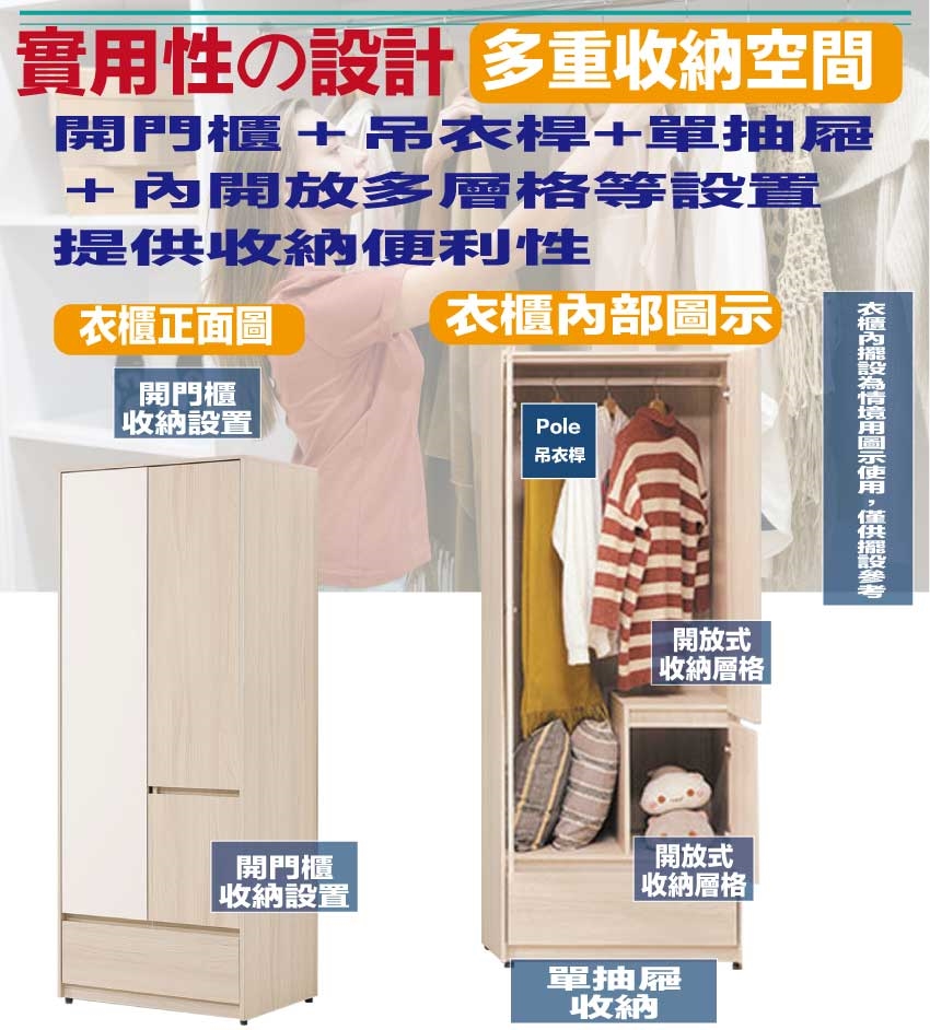 搭配採用開門櫃+吊衣桿+單抽屜+內開放式層格等收納空間設計