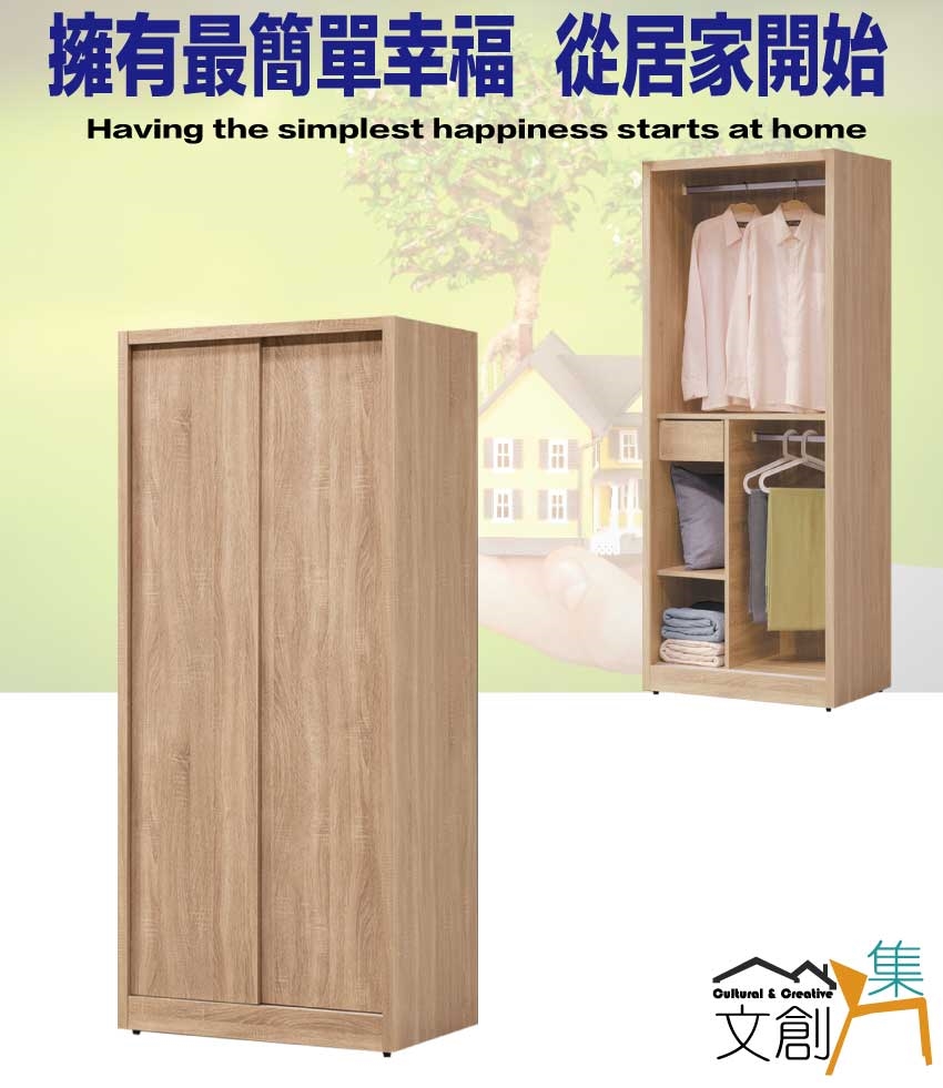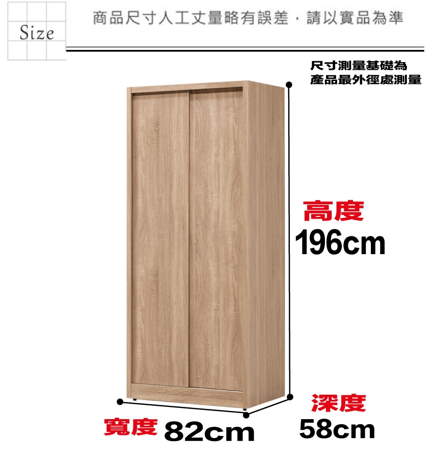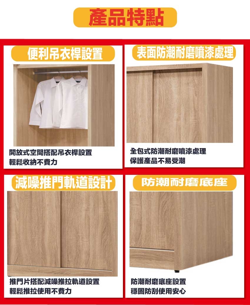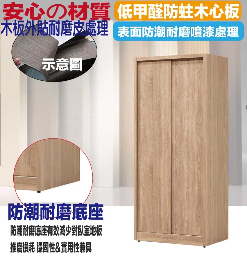 ★偏遠地區需額外加收運費,下標請先問與答詢問★ ★下訂前注意 由於商品流動較快,下訂前請先詢問是否有貨在下訂喔~★ 【綠家居】艾米2.7尺推門內雙吊衣櫃 橡木紋色系+安心材質製造,使用放心+搭配居家更便利,採用防蛀木心板+防潮耐磨底座等安心材質製造 ,外層採用防潮耐磨噴漆處理搭配採用推門櫃+吊衣桿+單抽屜+內開放層格等收納空間設計,全由專人配送到家,專業安心服務,替你省下更多時間!