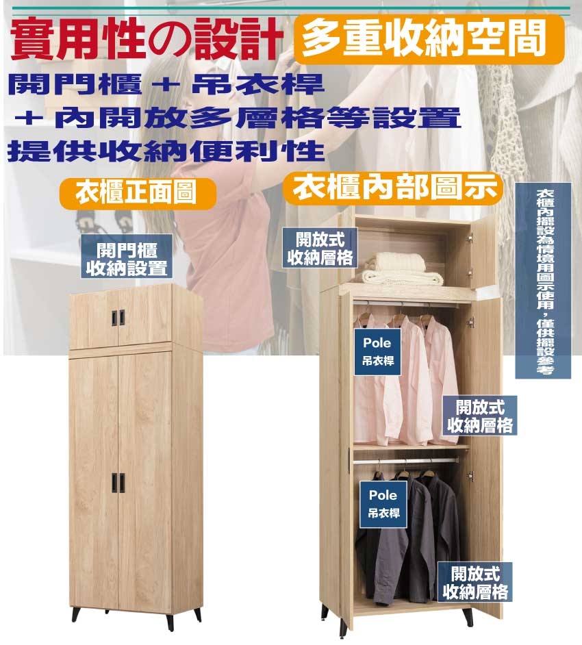 搭配採用開門櫃+吊衣桿+內開放層格等收納空間設計