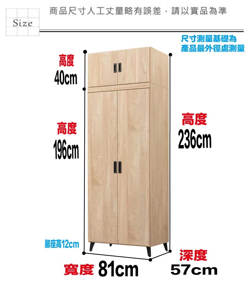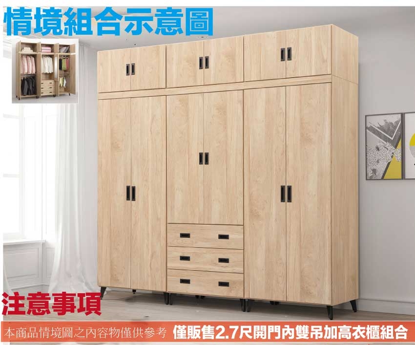 - ◆產品名稱:【綠家居】瑪卡利2.7尺四門內雙吊加高衣櫃組合
