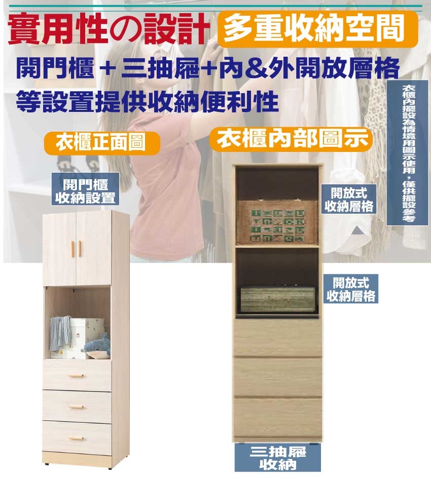 搭配採用開門櫃+吊衣桿+三抽屜+內&外開放層格等收納空間設計