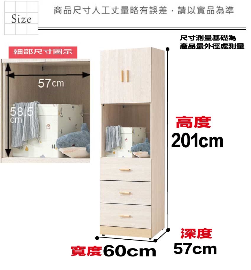 尺寸:(寬)60x(深)57x(高)201/公分 ◆材質: 材質:防蛀木心板+五金滑軌結構+防夾手緩衝門片五金+防潮耐磨底座 噴漆:防潮耐磨噴漆處理 ◎注意事項: 1.接單後,會有專員與您電聯確認送貨時間。 2.需以吊車吊運以當地吊車行情計,費用由消費者支付。 3.備註:本商品不含圖片上、家飾...等,情境圖之內容僅供參考。 4.請於配送人員到場時,檢查商品有無缺失,以免造成爭議。 5.允許的誤差尺寸範圍+-2%。 6.因拍攝燈光與電腦解析度瑩幕不同可能會造成實品與網頁上商品有些許色差,商品以收到實品為主。 ◎收貨與退貨: 1.實因特殊地型限制及(山區、濱海鄉、鎮、村、區)無法送貨時,本公司保有出貨與否之權利(下單後會由專人告知是否可配送)。 2.有電梯不收取費用! 無電梯樓層超過4樓以上(包含4樓)一樓層費用200元,現場支付給服務員。 3.超過鑑賞期,恕不接受退貨。 4.限非人為因素破壞毀損,才可退貨。 5.若退貨時,收件時間請與廠商協調,確保自己權益。 6.退貨時應保留贈品及附件完整(如有遺失部分,需酌收費用)。 ◎備註: .無回收服務。 .收貨與退貨:實因特殊地型限制及(山區、濱海鄉、鎮、村、區)無法送貨時,本公司保有出貨與否之權利(下單後會由專人告知是否可配送)。 .花蓮(縣市)、台東(縣市)、屏東(縣市場及其它縣市屬於山區、濱海鄉、鎮、村地區無配送服務,如您有需求,則需另外收取運費。(您可直接訂購,後續由廠商報價。) ※由於加價配送服務為一次消耗性商品,若有退換貨等情形加購之運費恕無法退還 ※運費報價皆為單趟計算。 ※使用加價配送地區,收貨時間會比一般地區再增加10個工作天。