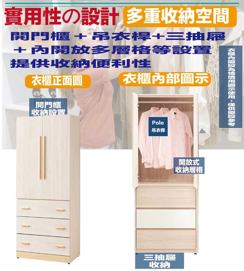 搭配採用開門櫃+吊衣桿+三抽屜+內開放層格等收納空間設計