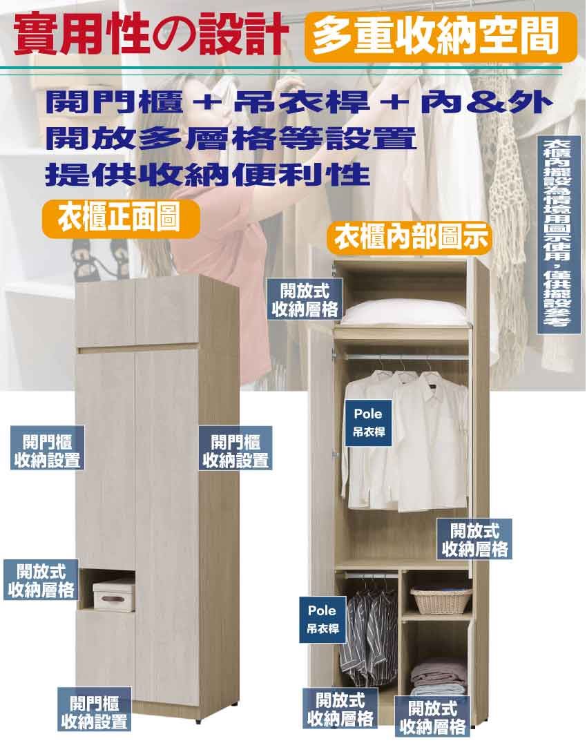 搭配採用開門櫃+吊衣桿+內開放多層格等收納空間設計