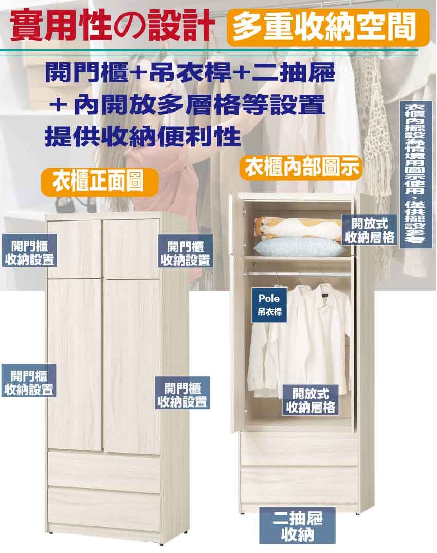 搭配採用開門櫃+吊衣桿+二抽屜+內開放多層格等收納空間設計