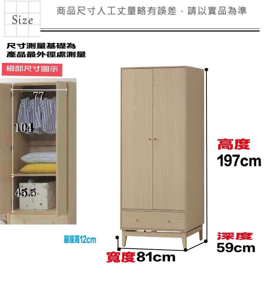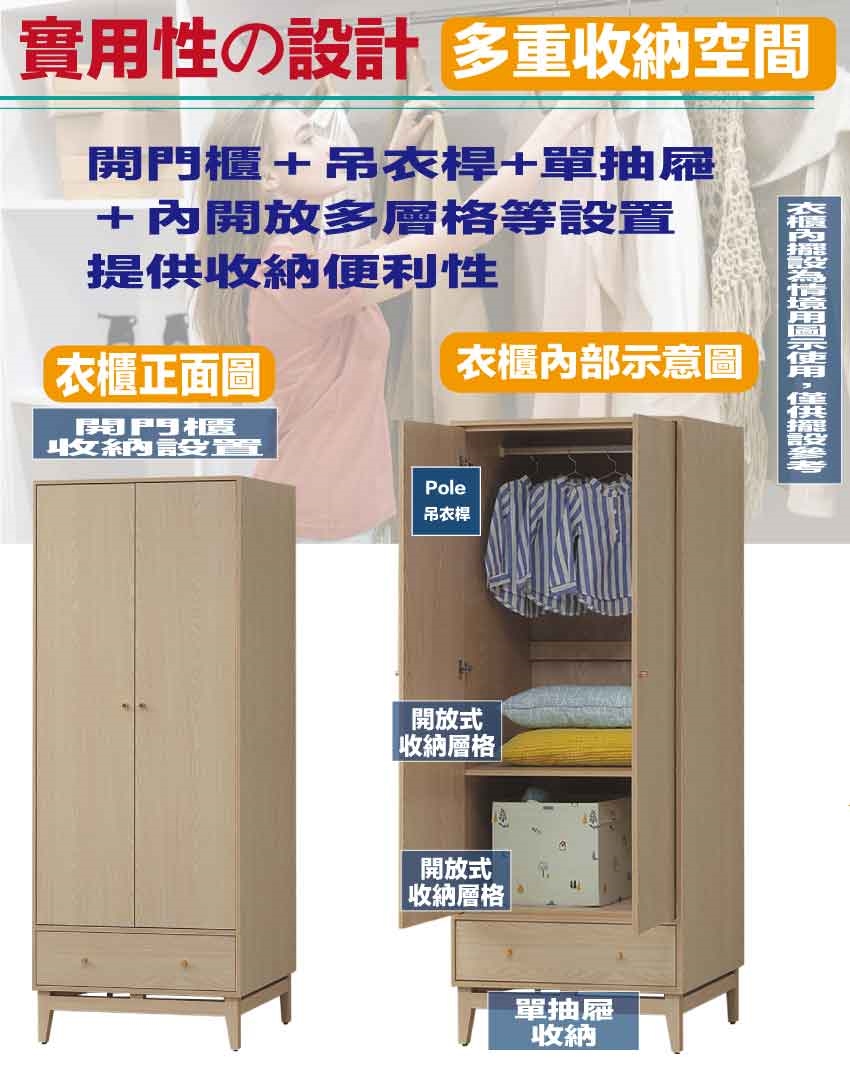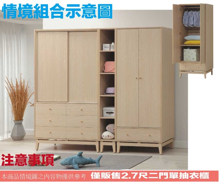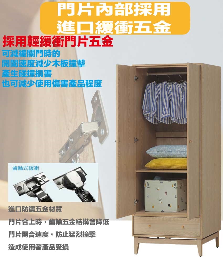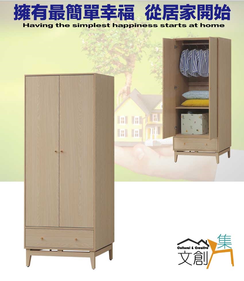 - ◆產品名稱:【綠家居】萬斯2.7尺二門單抽衣櫃
