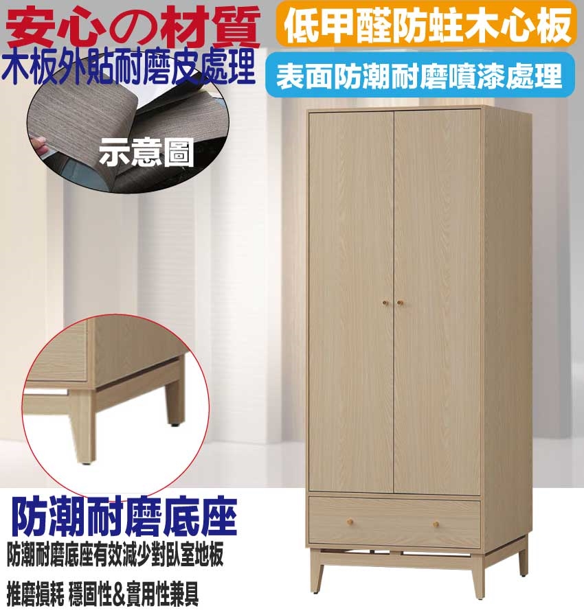 ★偏遠地區需額外加收運費,下標請先問與答詢問★ ★下訂前注意 由於商品流動較快,下訂前請先詢問是否有貨在下訂喔~★ 【綠家居】萬斯2.7尺二門單抽衣櫃 橡木紋色系+安心材質製造,使用放心+搭配居家更便利,採用防蛀木心板+防潮耐磨底座+五金滑軌結構+防夾手緩衝五金等安心材質製造 ,外層採用防潮耐磨噴漆處理搭配採用開門櫃+吊衣桿+單抽屜+內開放層格等收納空間設計,全由專人配送到家,專業安心服務,替你省下更多時間!