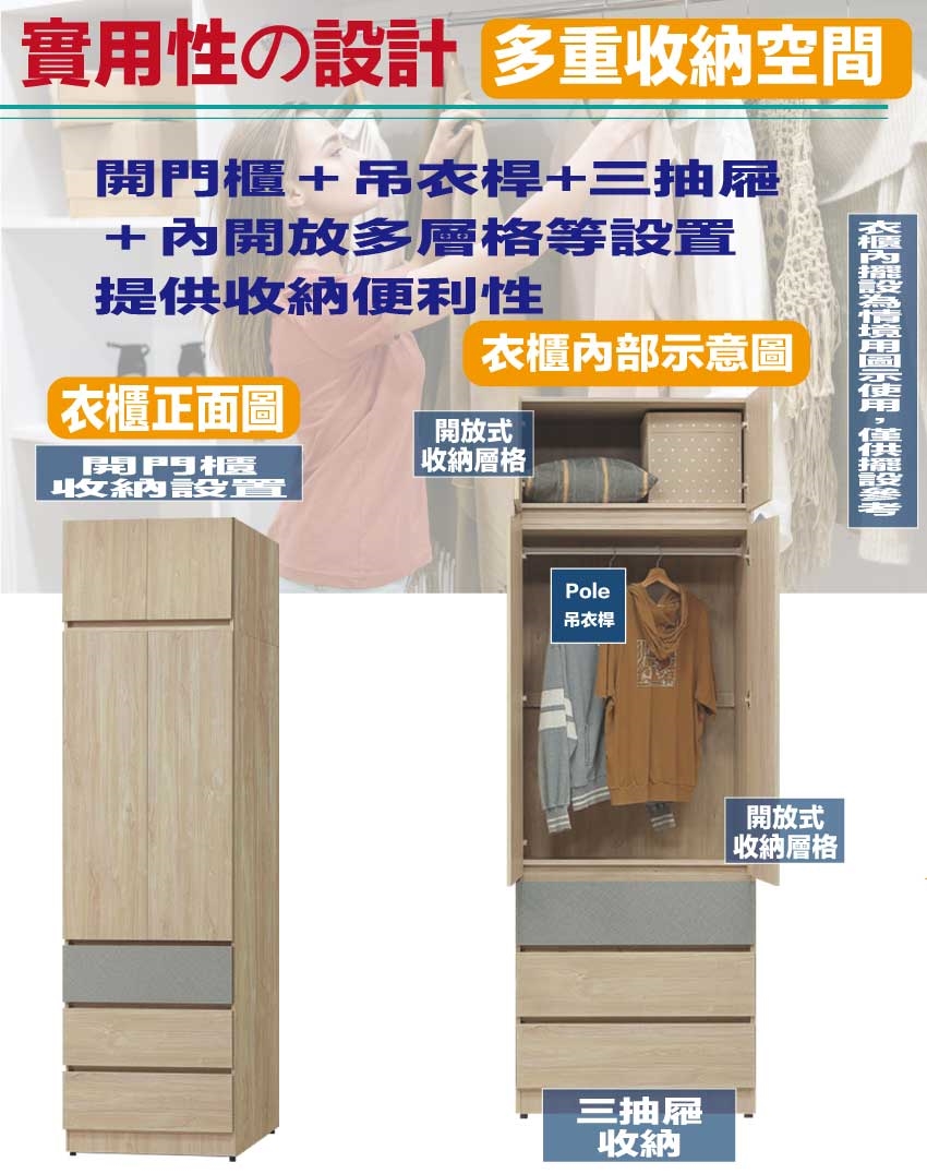 搭配採用開門櫃+吊衣桿+三抽屜+內開放層格等收納空間設計