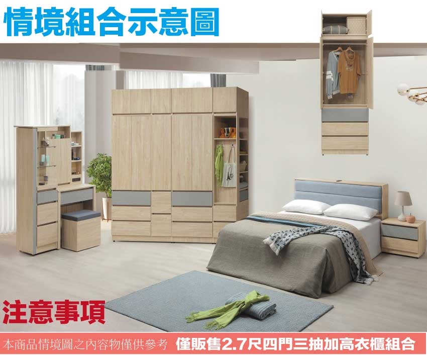 - ◆產品名稱:【綠家居】唐斯2.7尺四門三抽加高/衣櫃組合