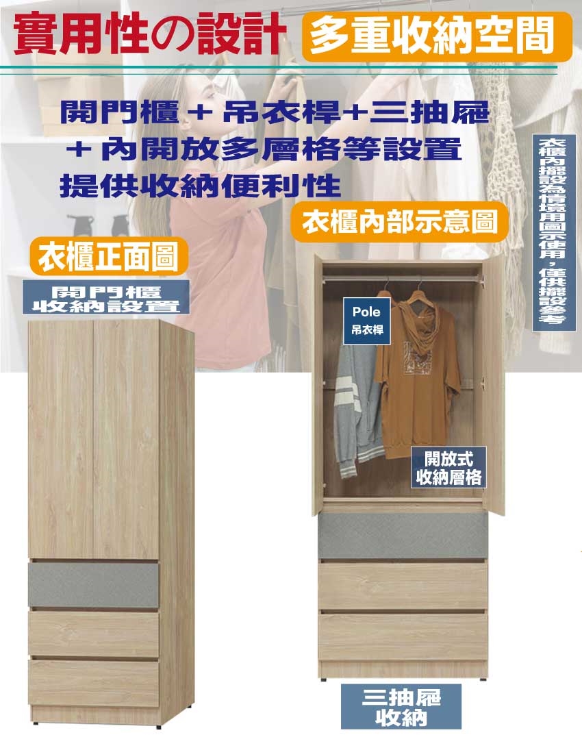 搭配採用開門櫃+吊衣桿+三抽屜+內開放層格等收納空間設計