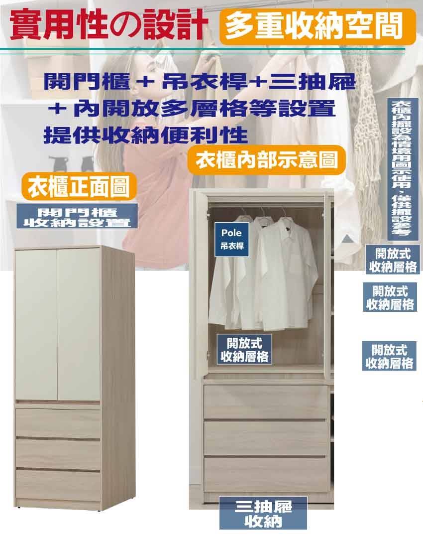 搭配採用開門櫃+吊衣桿+三抽屜+內開放層格等收納空間設計