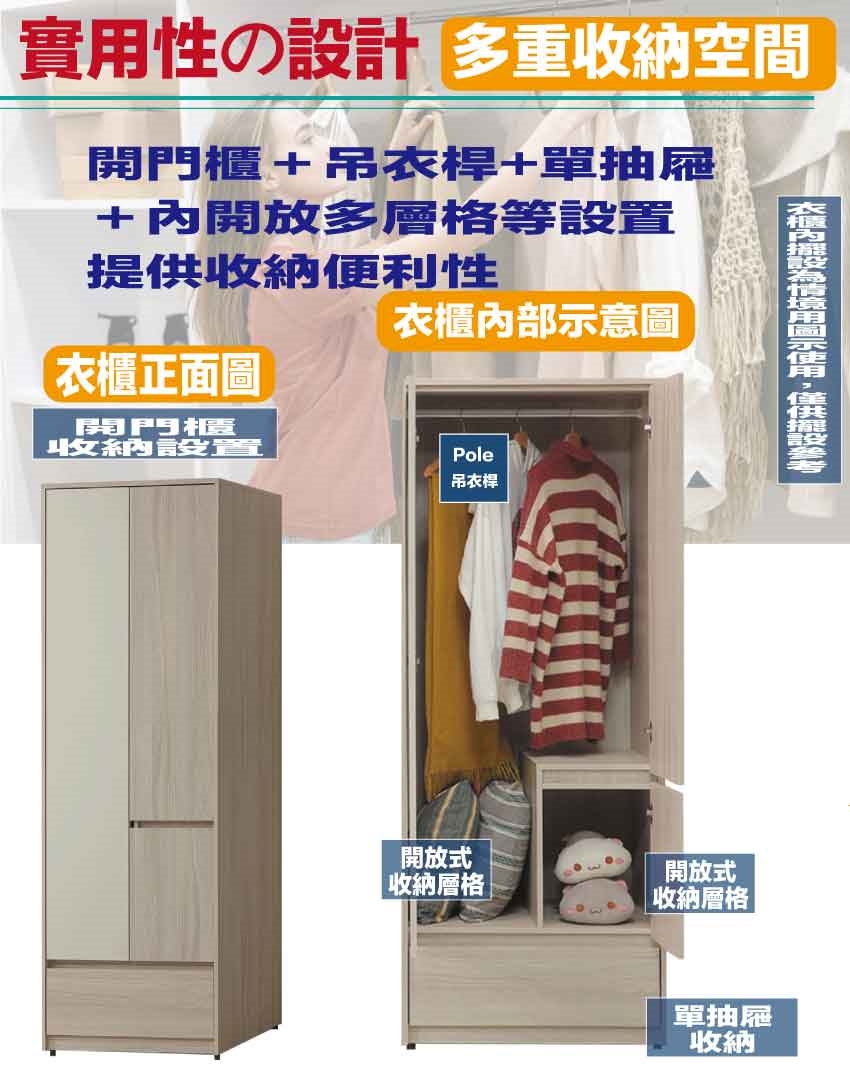 搭配採用開門櫃+吊衣桿+單抽屜+內開放層格等收納空間設計