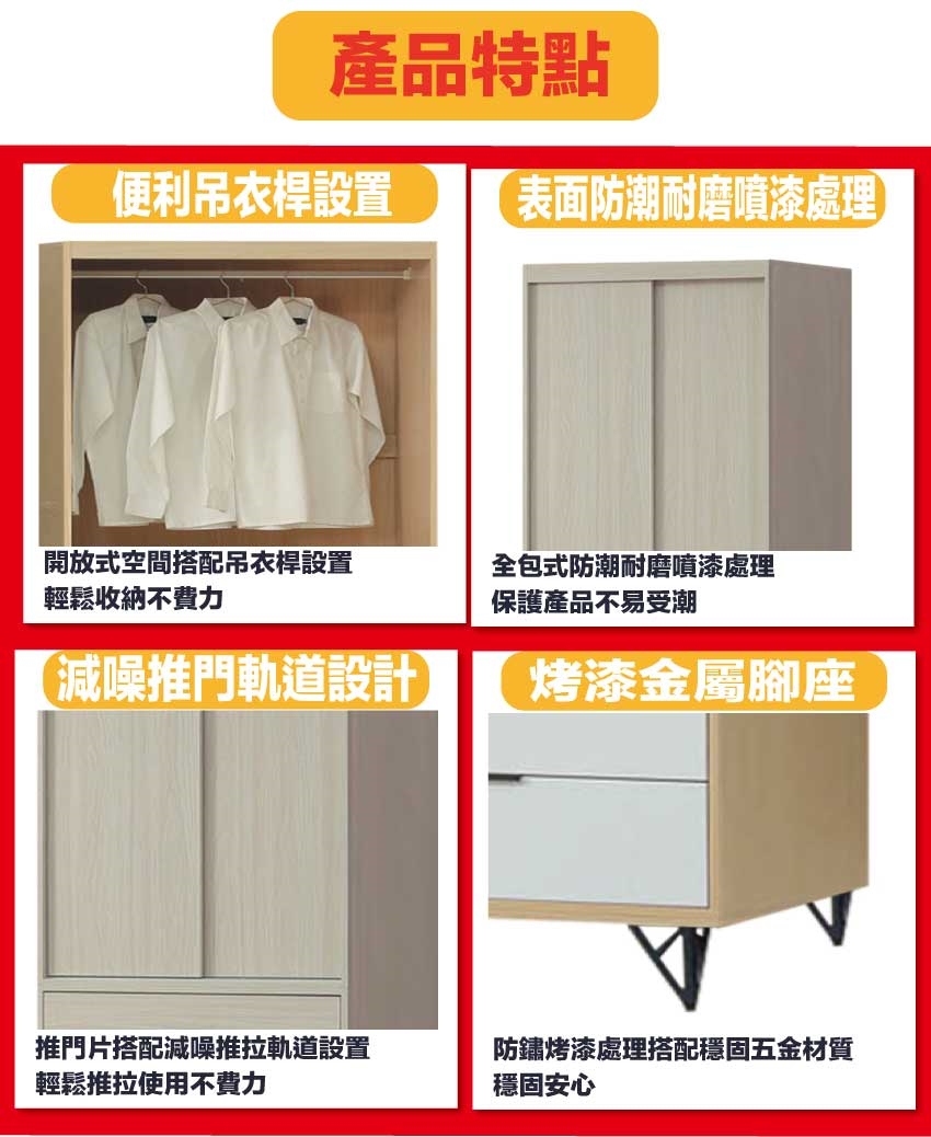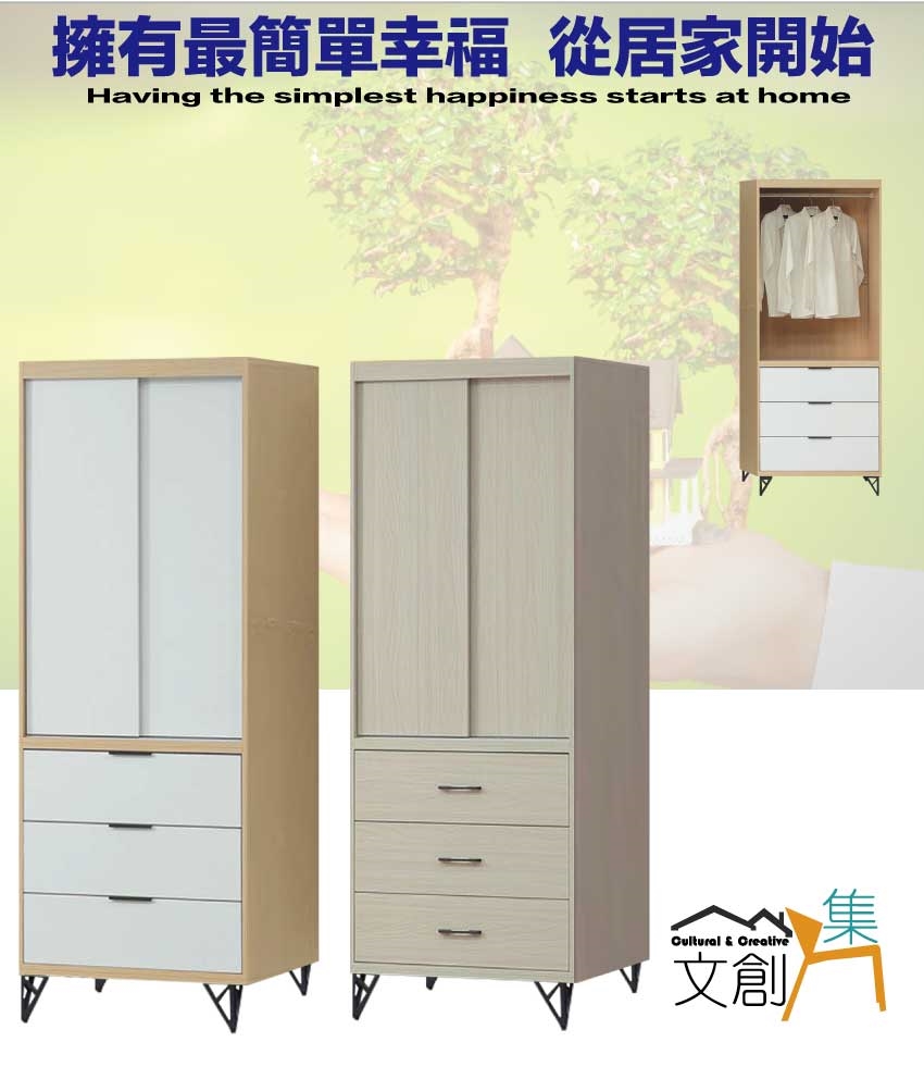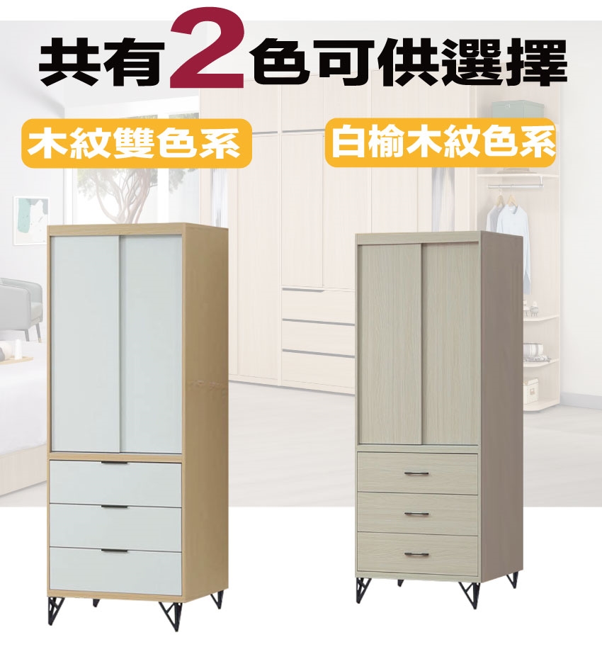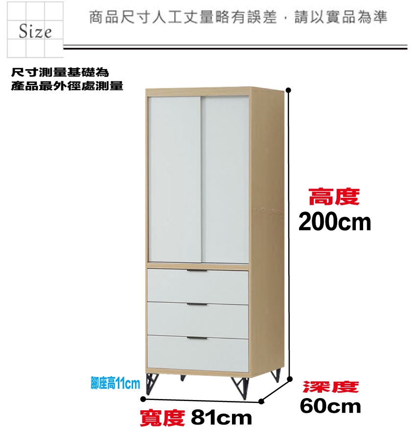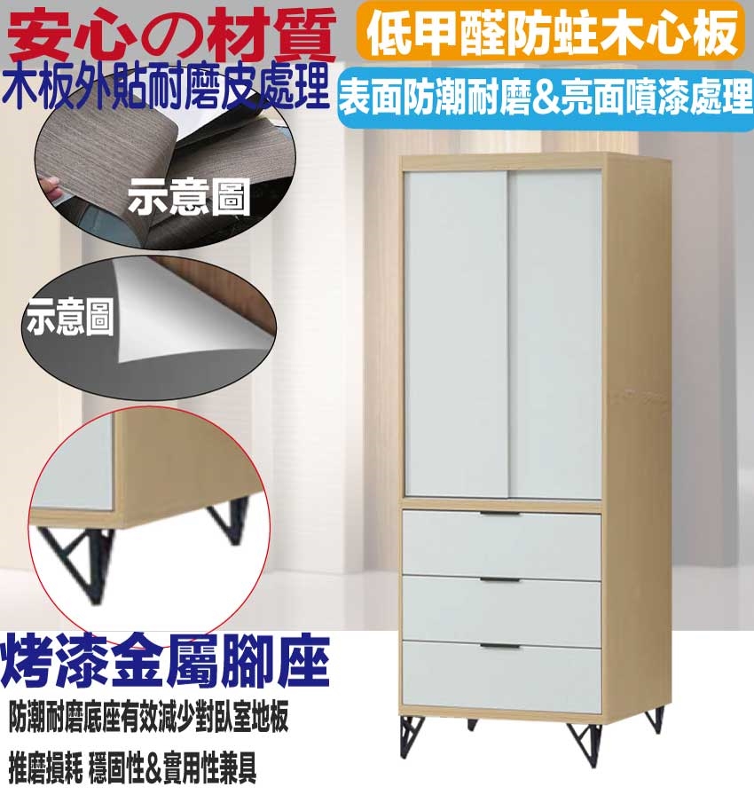 ★偏遠地區需額外加收運費,下標請先問與答詢問★ ★下訂前注意 由於商品流動較快,下訂前請先詢問是否有貨在下訂喔~★ 【綠家居】普伊斯2.7尺推門三抽鐵腳衣櫃(二色可選) 二色可選+安心材質製造,使用放心+搭配居家更便利,採用防蛀木心板+烤漆五金腳座+五金滑軌結構等安心材質製造 ,外層採用防潮耐磨噴漆處理搭配採用推門櫃+吊衣桿+三抽屜+內開放層格等收納空間設計,全由專人配送到家,專業安心服務,替你省下更多時間!