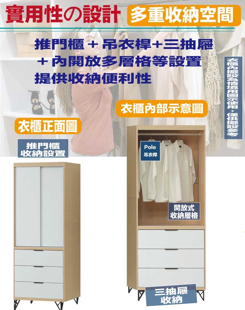 搭配採用推門櫃+吊衣桿+三抽屜+內開放層格等收納空間設計