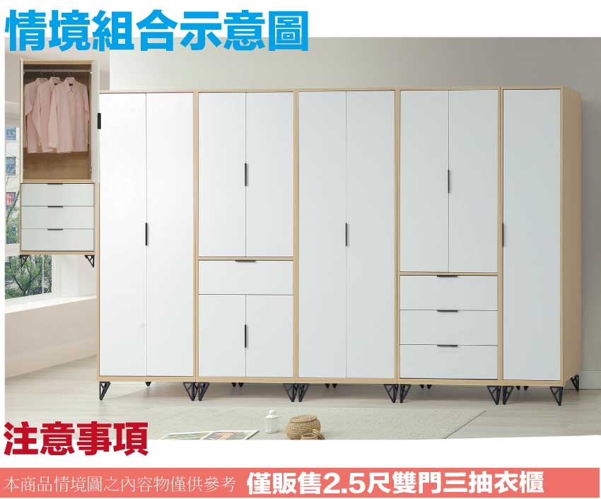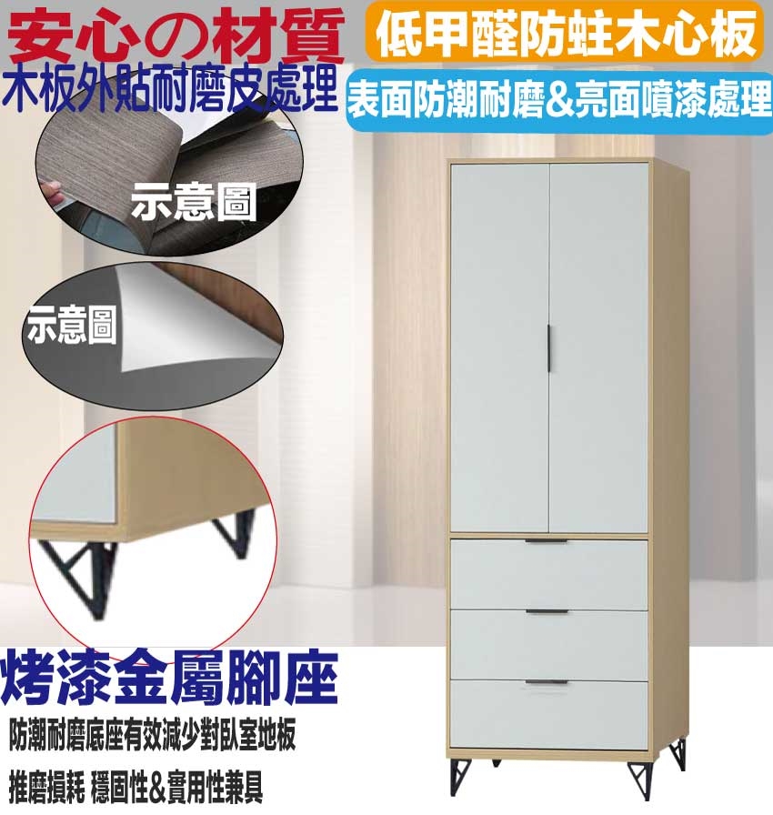 ★偏遠地區需額外加收運費,下標請先問與答詢問★ ★下訂前注意 由於商品流動較快,下訂前請先詢問是否有貨在下訂喔~★ 【綠家居】普伊斯2.5尺二門三抽鐵腳衣櫃(二色可選) 二色可選+安心材質製造,使用放心+搭配居家更便利,採用防蛀木心板+五金滑軌結構+烤漆五金腳座+防夾手緩衝五金等安心材質製造 ,外層採用防潮耐磨噴漆處理搭配採用開門櫃+吊衣桿+三抽屜+內開放層格等收納空間設計,全由專人配送到家,專業安心服務,替你省下更多時間!