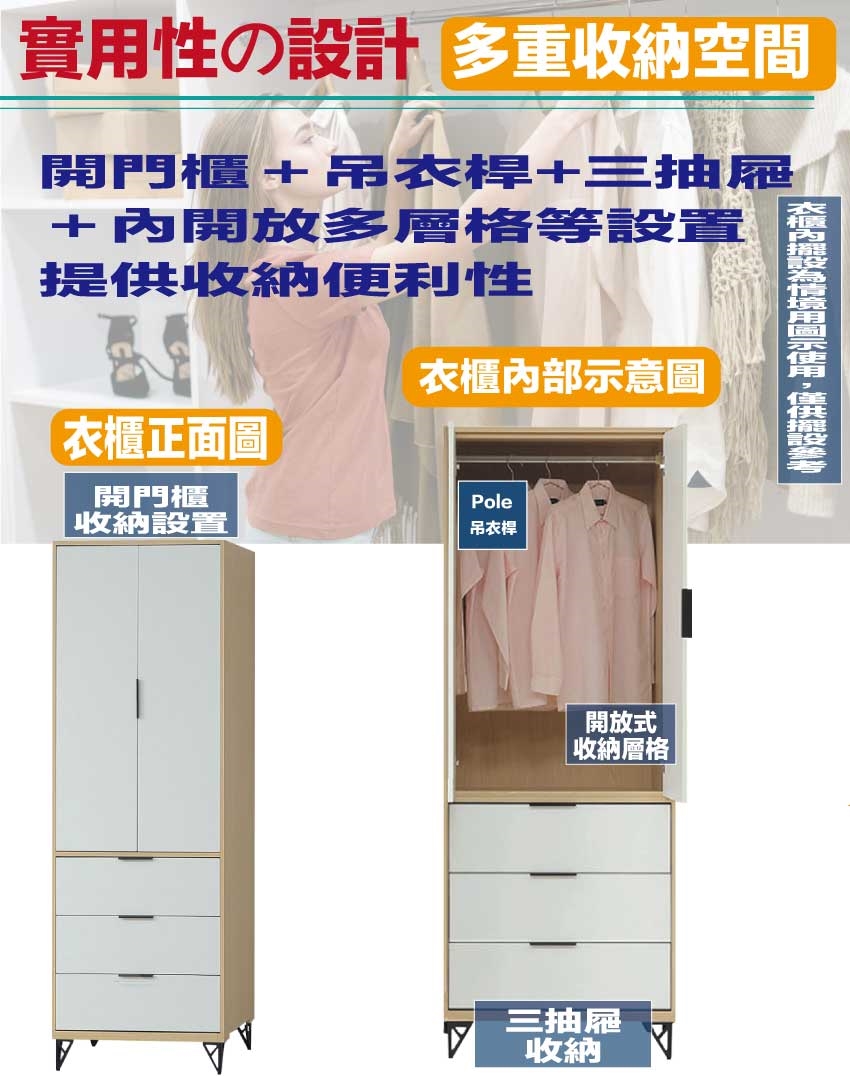 搭配採用開門櫃+吊衣桿+三抽屜+內開放層格等收納空間設計