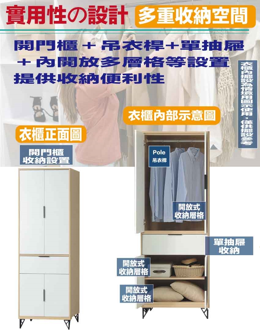 搭配採用開門櫃+吊衣桿+單抽屜+內開放層格等收納空間設計