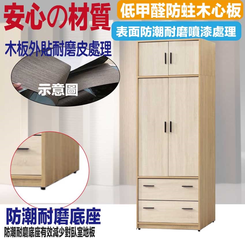 ★偏遠地區需額外加收運費,下標請先問與答詢問★ ★下訂前注意 由於商品流動較快,下訂前請先詢問是否有貨在下訂喔~★ 【綠家居】羅比斯2.5尺四門二抽衣櫃加高組合 木紋雙色系+安心材質製造,使用放心+搭配居家更便利,採用防蛀木心板+防潮耐磨底座+五金滑軌結構+防夾手緩衝門片五金等安心材質製造 ,外層採用防潮耐磨噴漆處理搭配採用開門櫃+吊衣桿+二抽屜+內開放層格等收納空間設計,全由專人配送到家,專業安心服務,替你省下更多時間!
