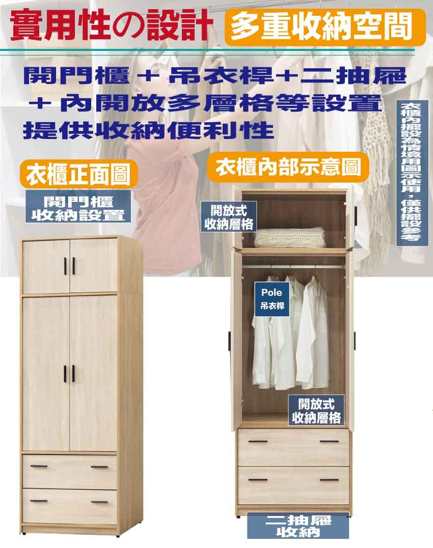 搭配採用開門櫃+吊衣桿+二抽屜+內開放層格等收納空間設計