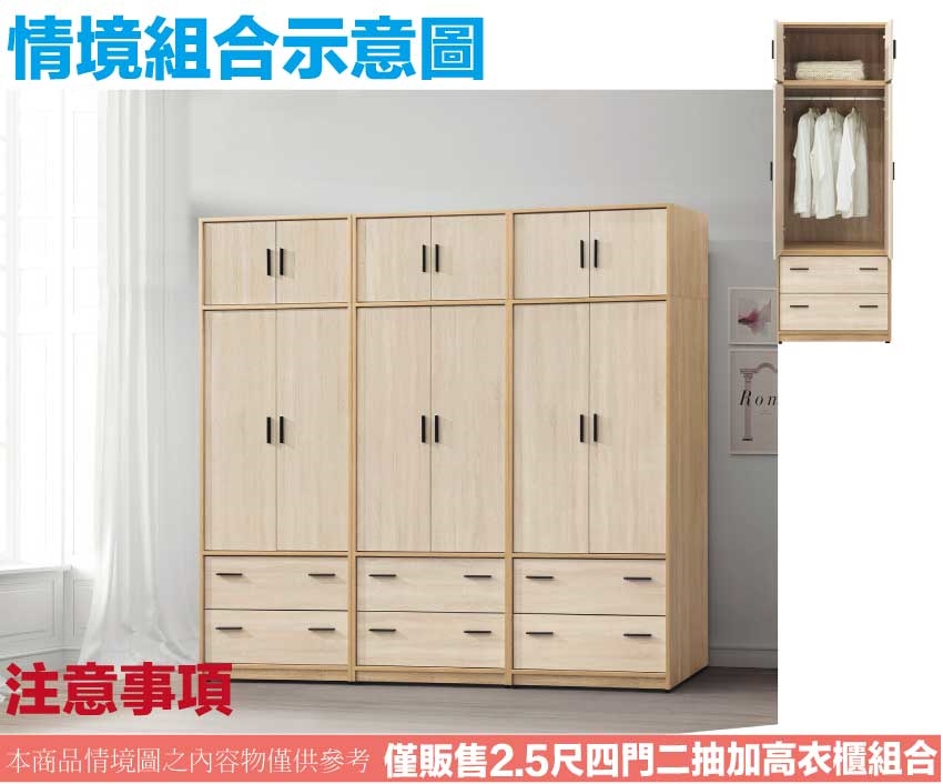 - ◆產品名稱:【綠家居】羅比斯2.5尺四門二抽衣櫃加高組合