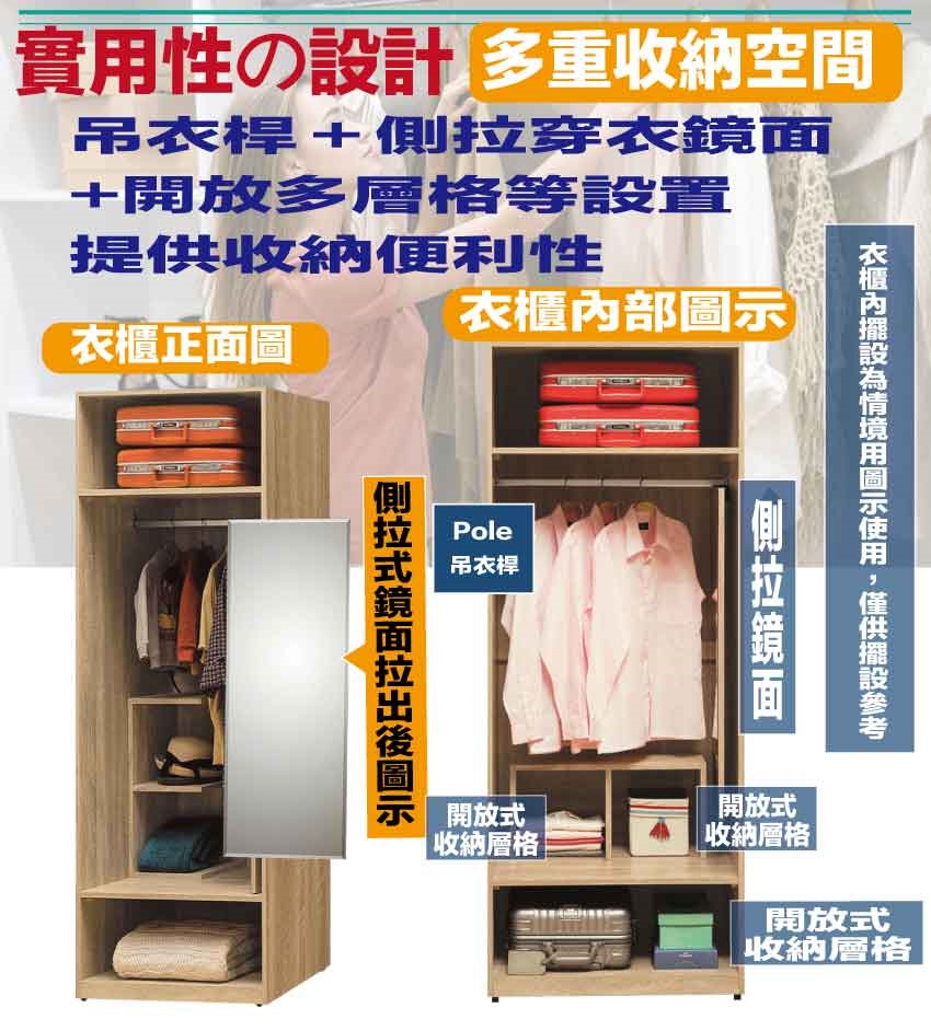 採用吊衣桿+內含側拉鏡面+開放層格等收納空間設計