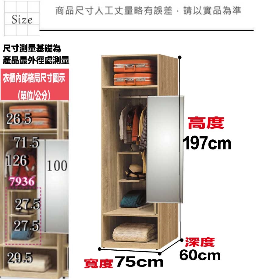 - 尺寸:(寬)75x(深)60x(高)197/公分