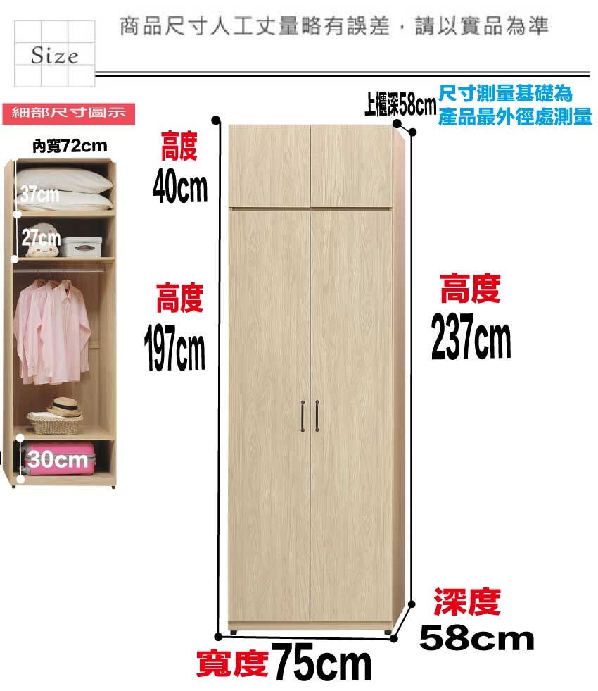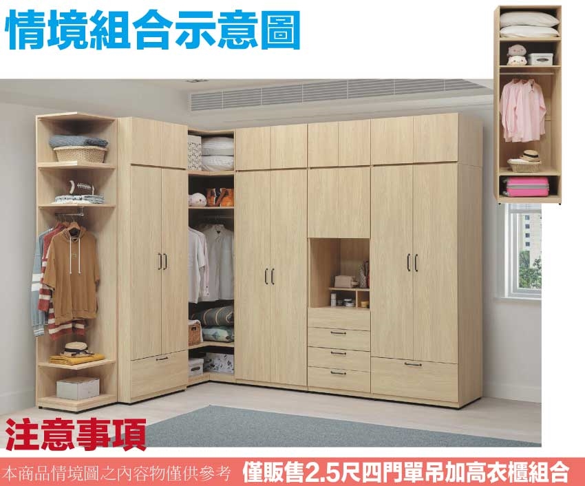 - ◆產品名稱:【綠家居】艾珊2.5尺四門內單吊多格加高衣櫃組合