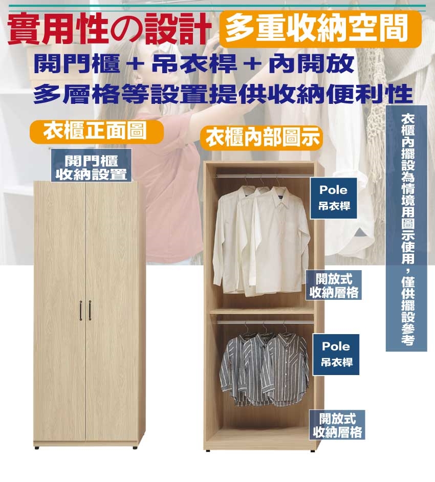 採用開門櫃+吊衣桿+內開放層格等收納空間設計