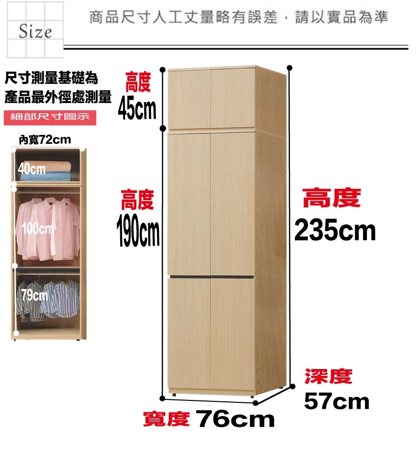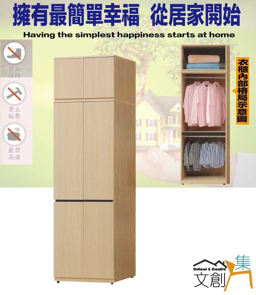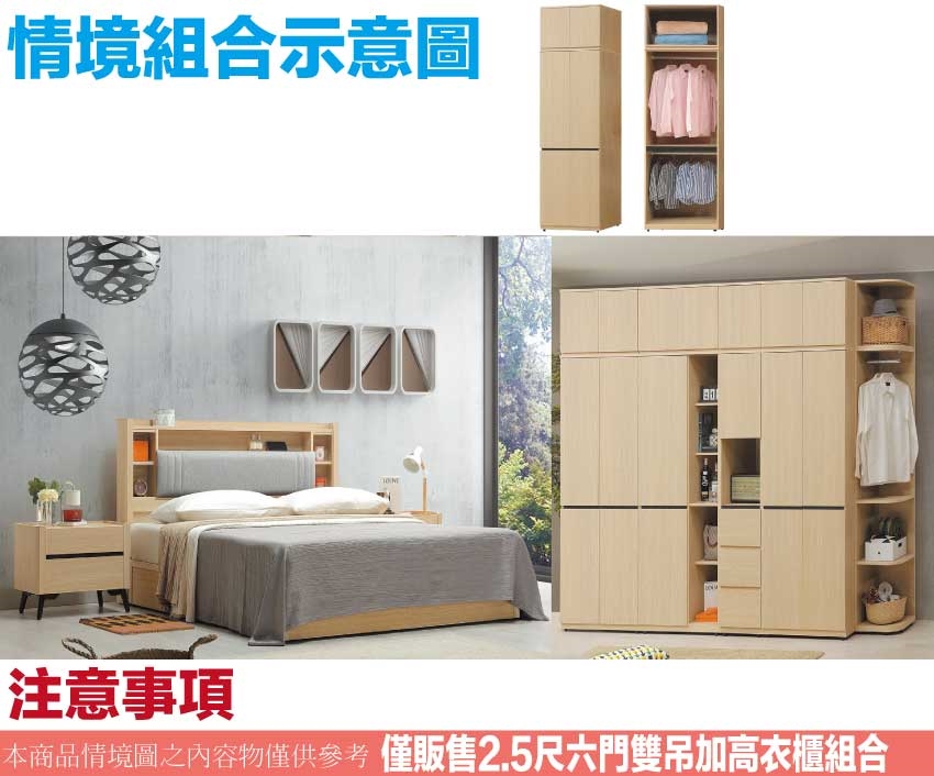 - ◆產品名稱:【綠家居】維珊2.5尺六門內雙吊加高衣櫃組合
