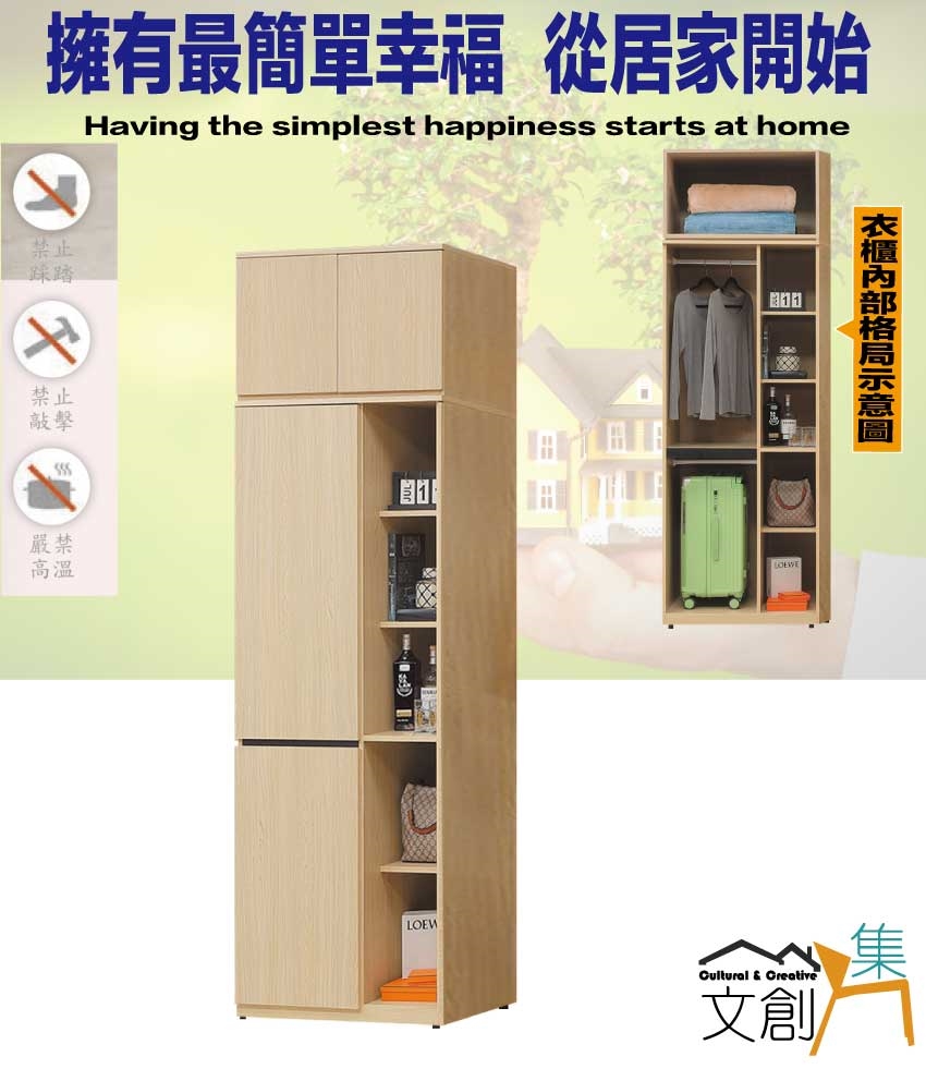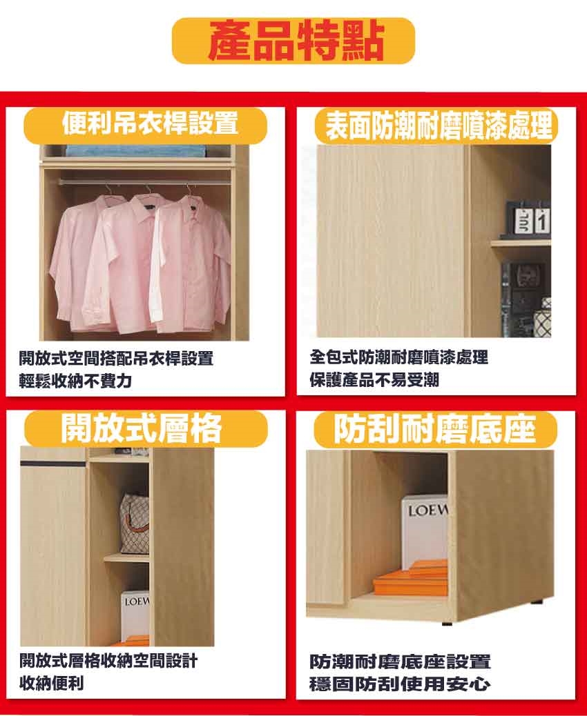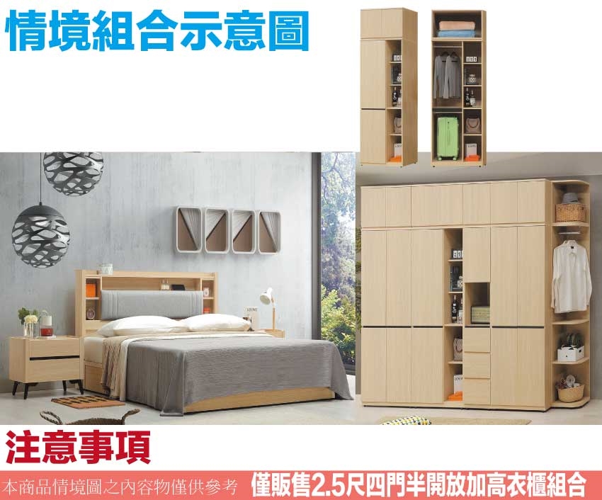 - ◆產品名稱:【綠家居】維珊2.5尺四門雙吊半開放加高衣櫃組合