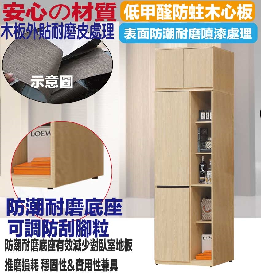 材質:防蛀木心板+防潮耐磨底座(可調高低水平)+防夾手緩衝門片五金