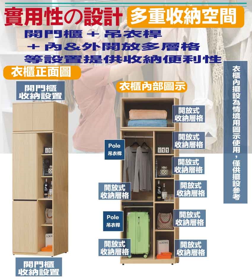開門櫃+吊衣桿+內&外開放層格
