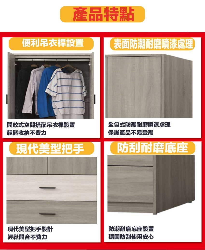 材質:防蛀木心板+防潮耐磨底座(可調高低水平)+防夾手緩衝門片五金