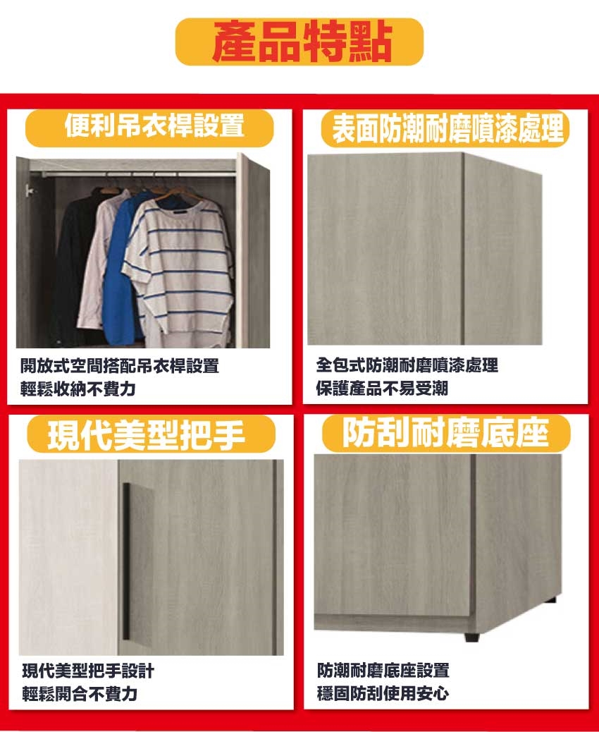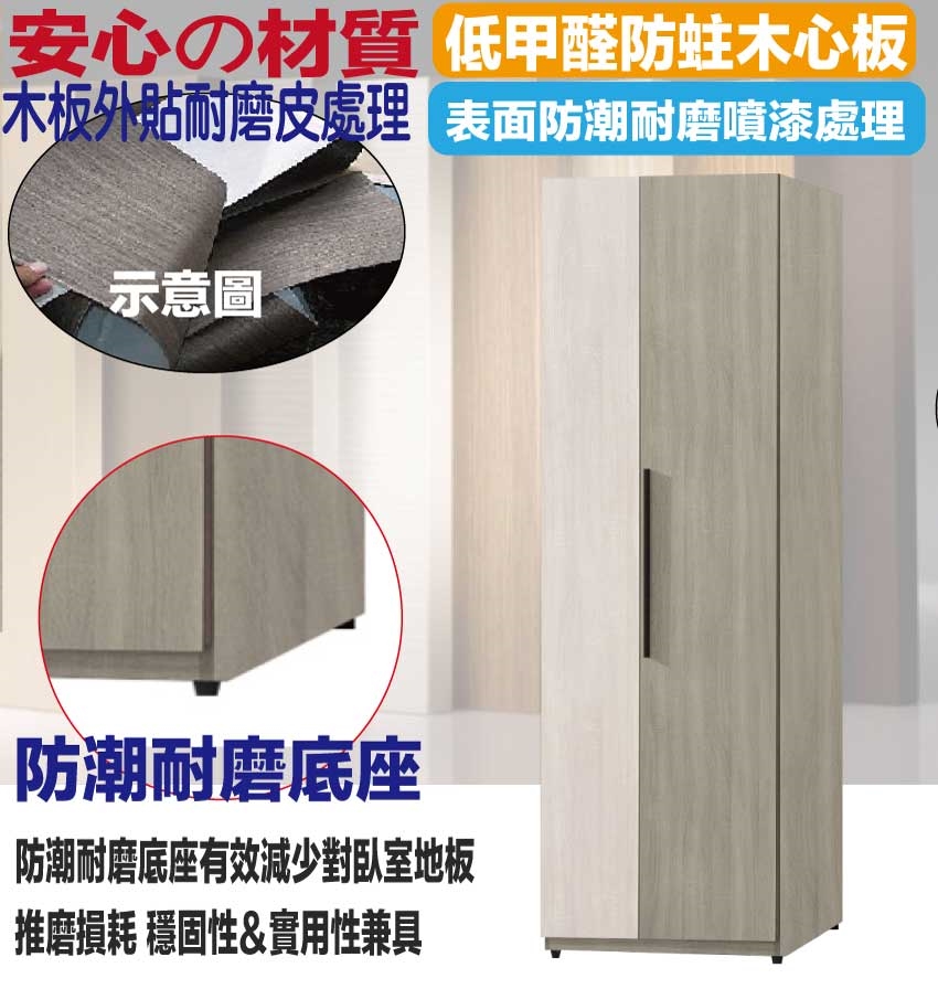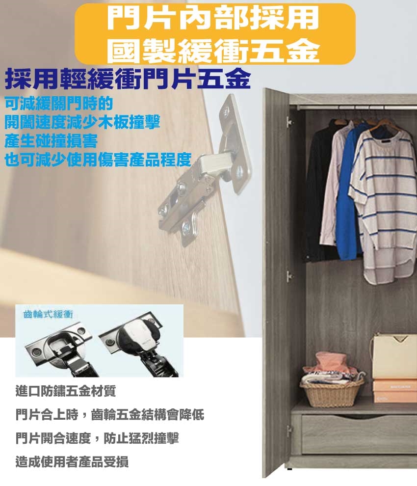 材質:防蛀木心板+防潮耐磨底座(可調高低水平)+防夾手緩衝門片五金