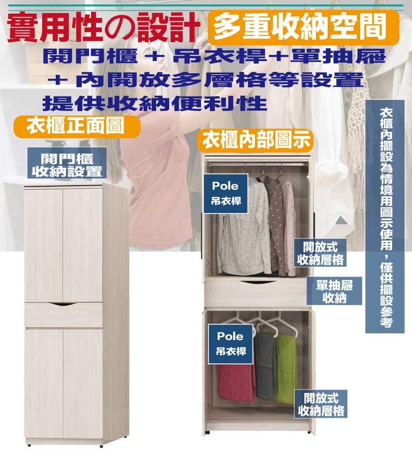 採用開門櫃+吊衣桿+單抽屜+內開放層格等收納空間設計