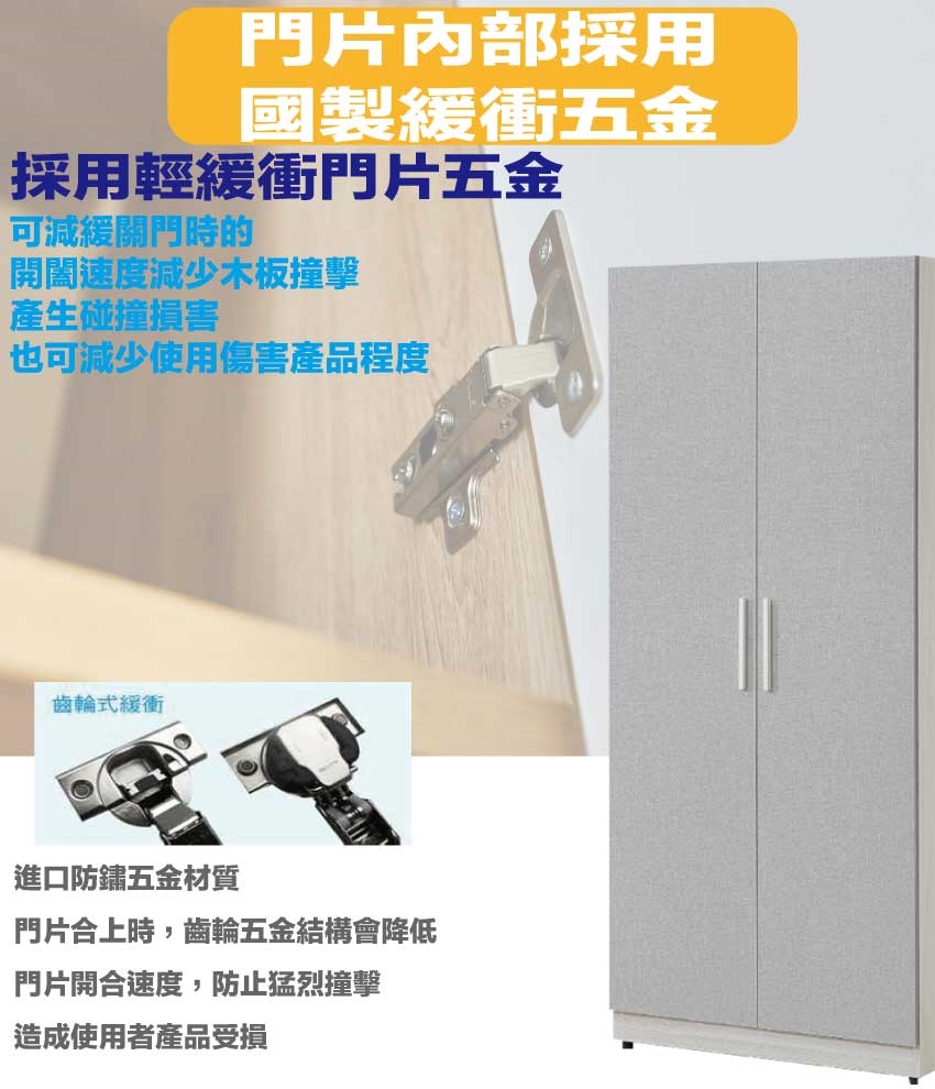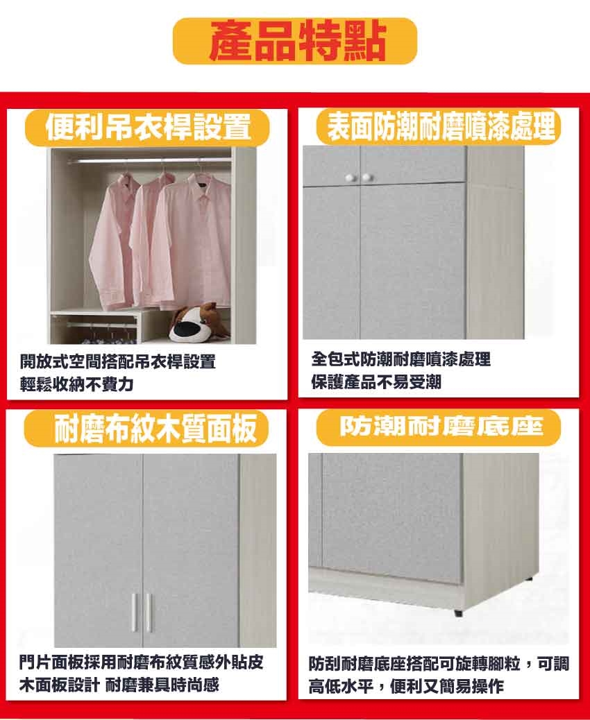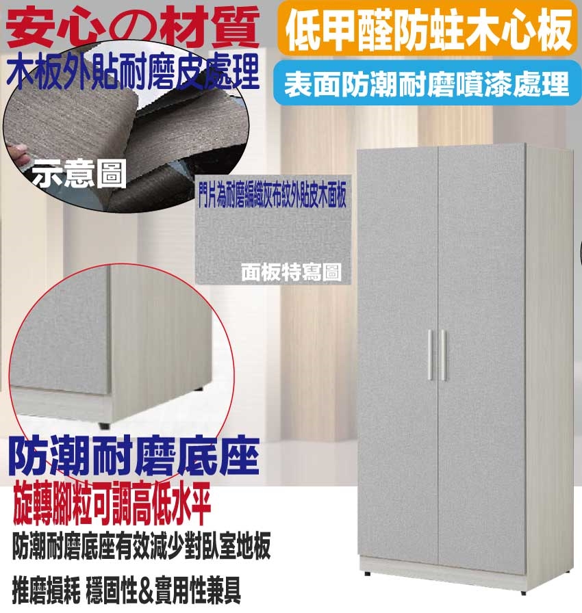 防蛀木心板+防潮耐磨底座(可調高低水平)+防夾手緩衝門片五金+門片為耐磨編織木紋貼皮等安心材質製造