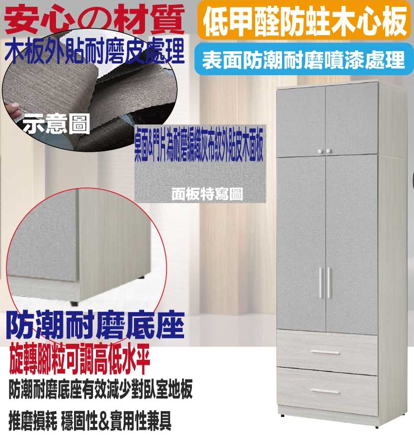 ★偏遠地區需額外加收運費,下標請先問與答詢問★ ★下訂前注意 由於商品流動較快,下訂前請先詢問是否有貨在下訂喔~★ 【綠家居】菲可2.5尺四門二抽加高衣櫃組合 木紋雙色系+現代簡約風格+安心材質製造,使用放心+搭配居家更便利,整體採用防蛀木心板+防潮耐磨底座(可調高低水平)+防夾手緩衝門片五金+門片為耐磨編織木紋貼皮等安心材質製造搭配外層採用防潮耐磨噴漆處理 ,採用開門櫃+吊衣桿+二抽屜+內開放層格等收納空間設計,全由專人配送到家,專業安心服務,替你省下更多時間!