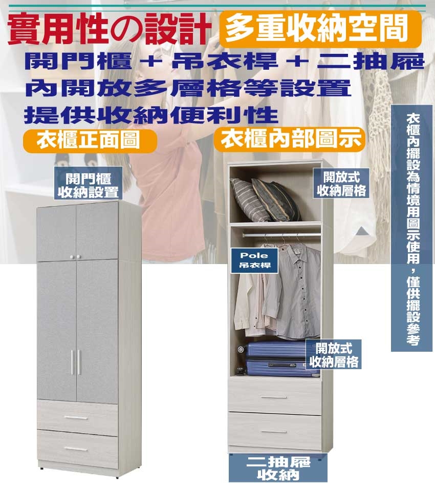 採用開門櫃+吊衣桿+二抽屜+內開放層格等收納空間設計