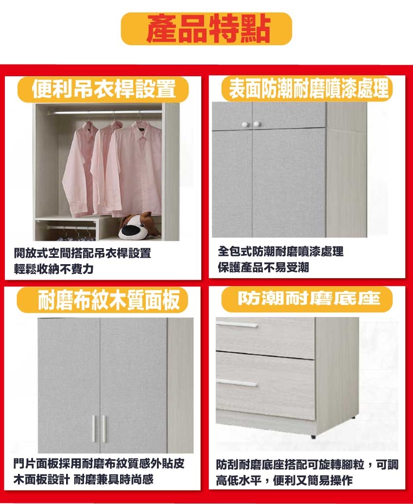 防蛀木心板+防潮耐磨底座(可調高低水平)+防夾手緩衝門片五金+門片為耐磨編織木紋貼皮等安心材質製造