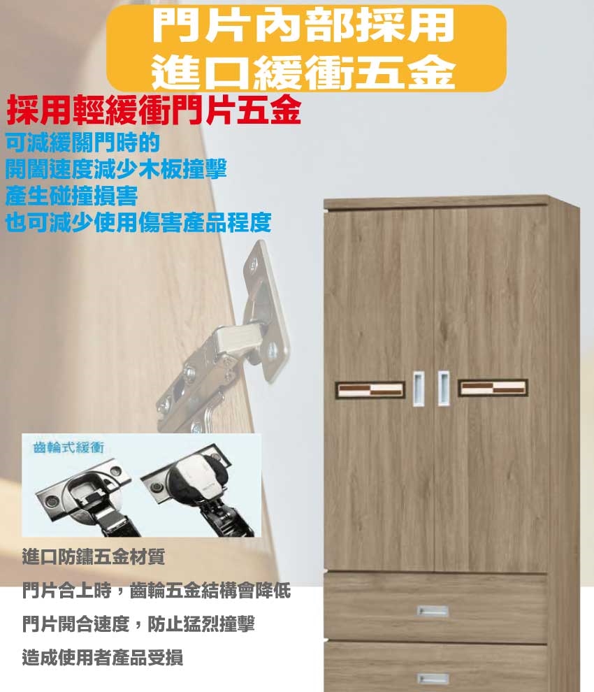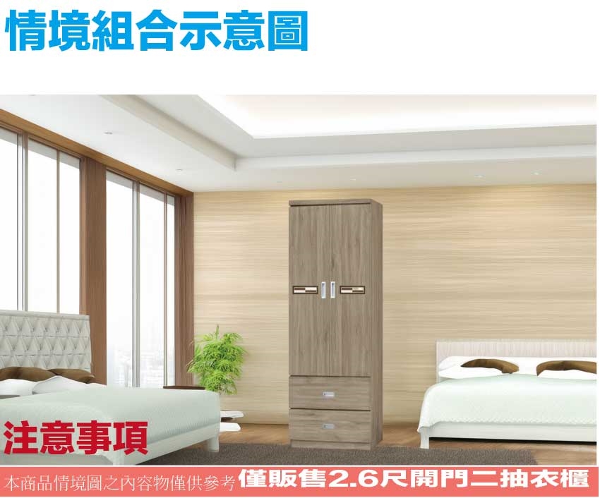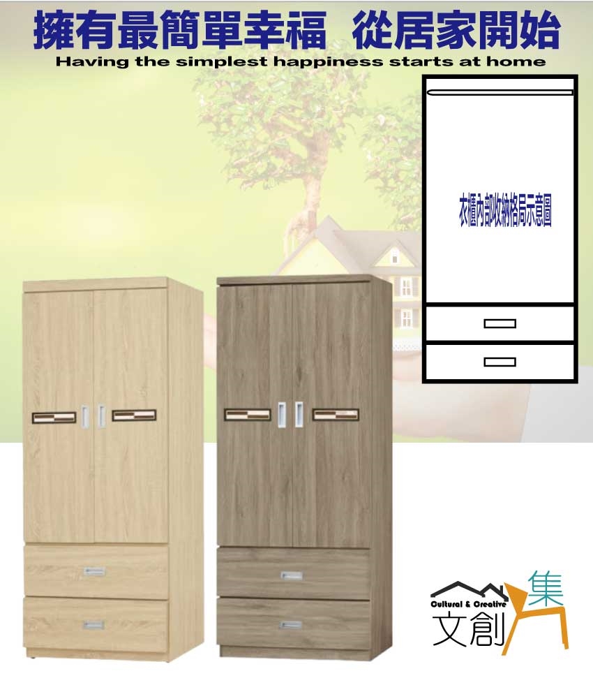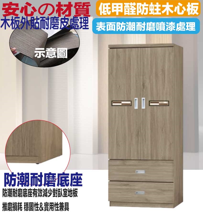 【綠家居】賽博斯2.6尺二門二抽衣櫃(二色可選) 二色可選+安心材質製造,使用放心+搭配居家更便利,採用防蛀木心板+防潮耐磨底座+五金滑軌結構+防夾手緩衝門片五金等安心材質製造 ,外層採用防潮耐磨噴漆處理搭配採用開門櫃+吊衣桿+二抽屜+內開放層格等收納空間設計,全由專人配送到家,專業安心服務,替你省下更多時間!