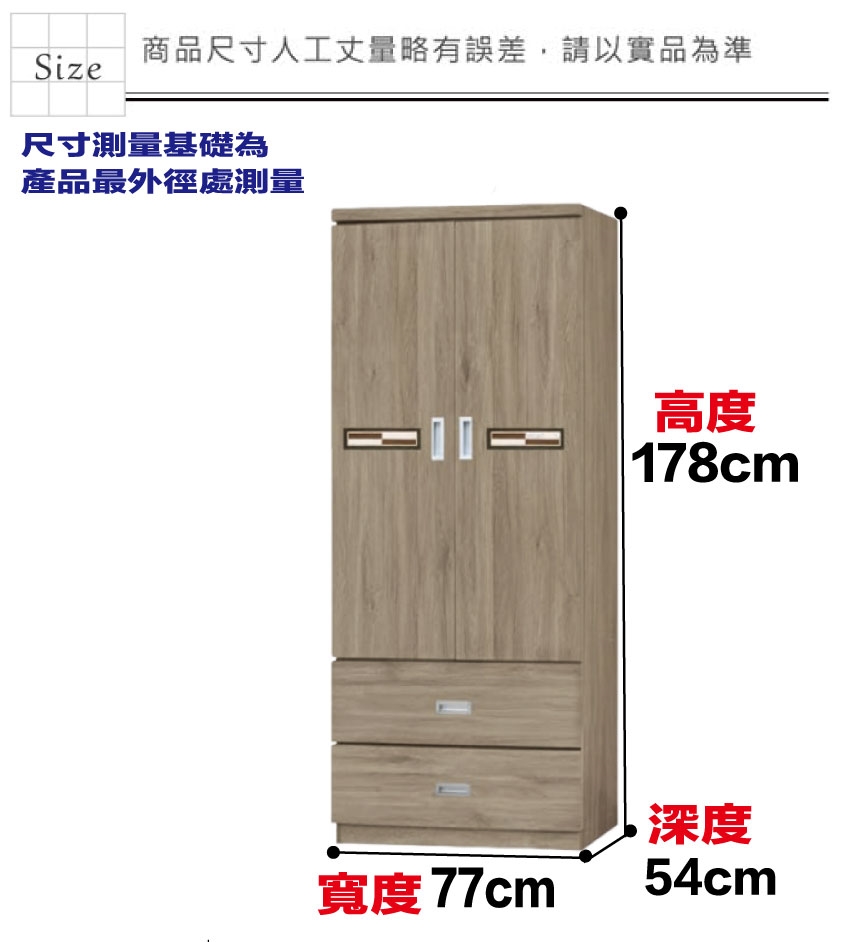 產品名稱:【綠家居】賽博斯2.6尺二門二抽衣櫃(二色可選) - 尺寸:(寬)77x(深)54x(高)178/公分