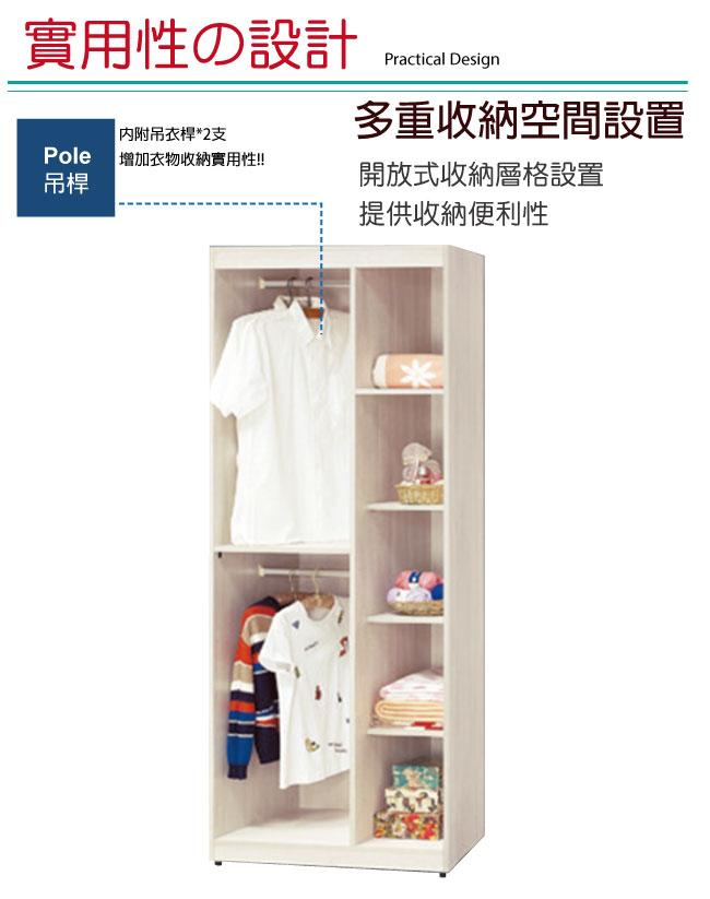二吊桿+開放式層格等收納設計,讓您保持空間整齊乾淨不再是夢想