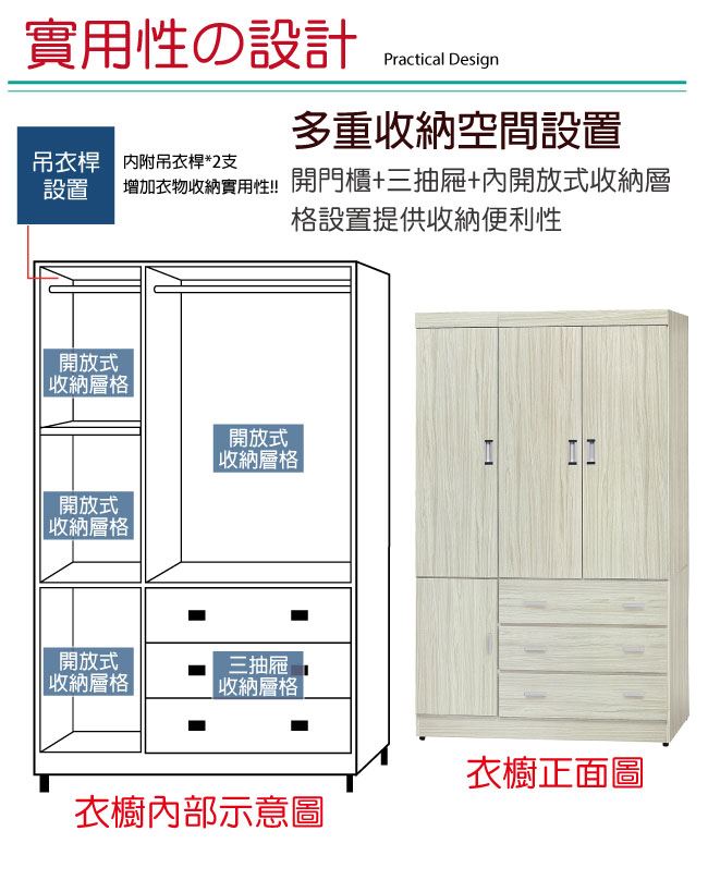 - 開門櫃+三抽屜+內開放式層格