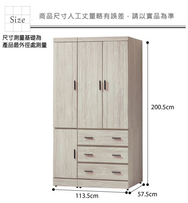 材質 | ◆產品名稱:【綠家居】德里 現代3.8尺四門三抽衣櫃/收納櫃 產品尺寸: 尺寸:(寬)113.5x(深)57.5x(高)200.5/公分 ◆材質: 材質:防蛀木心板+耐磨防刮腳座 材質:五金滑軌結構 塗漆:優利坦三層全包式耐磨塗漆塗裝處理 |
