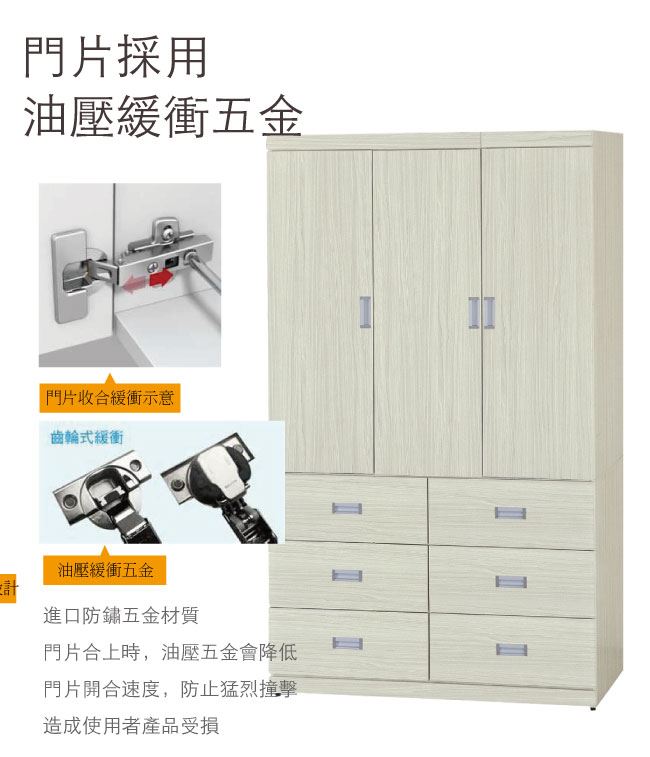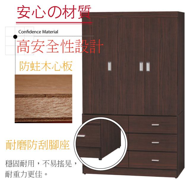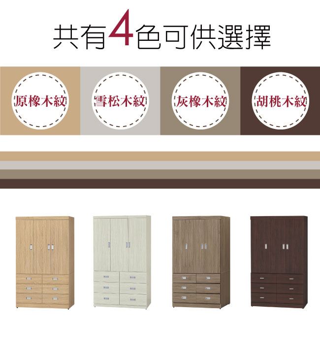 商品介紹 | 【綠家居】向佐 時尚3.9尺三門六抽衣櫃(四色可選) 四色可選+現代簡約風格+安心材質製造,整體採用防蛀木心板+防潮耐磨腳座+五金滑軌結構+防夾手緩衝門片五金等安心材質製造,產品外層採用防潮耐磨噴漆處理搭配採用開門櫃+吊衣桿+六抽屜內開放式層格等收納空間設計,全由專人配送到家,專業安心服務,替你省下更多時間! 【商品特色】 四色可選+現代簡約風格+安心材質製造,使用放心+搭配居家更便利 採用防蛀木心板+防潮耐磨腳座+五金滑軌結構+防夾手緩衝門片五金等安心材質製造 產品外層採用防潮耐磨噴漆處理 搭配採用開門櫃+吊衣桿+六抽屜+內開放式層格等收納空間設計 此商品不需要DIY組立,此商品為組立後之成品 品質保證、專業設計、貼心服務 全由專人配送到家,專業安心服務,替您省下更多時間 |