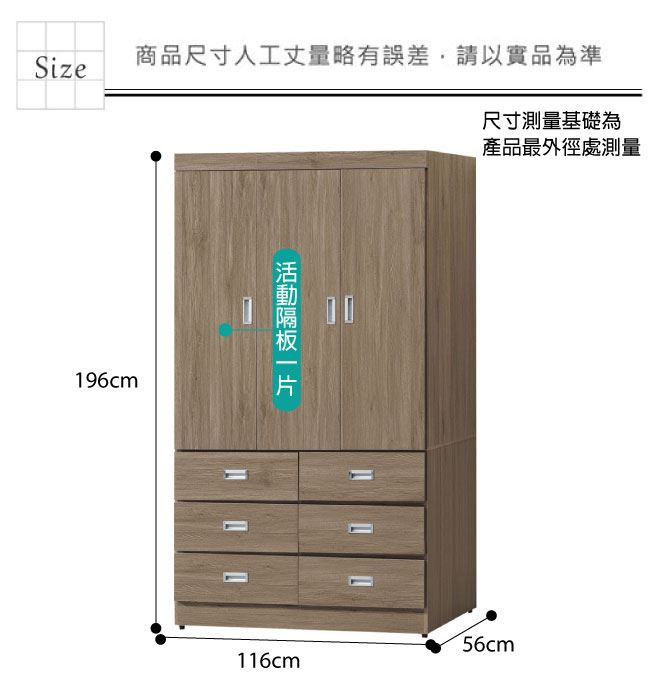 材質 | ◆產品名稱: 【綠家居】向佐 時尚3.9尺三門六抽衣櫃(四色可選) 尺寸:(寬)116x(深)56x(高)196/公分 ◆材質: 材質:防蛀木心板+防潮耐磨腳座+五金滑軌結構+防夾手緩衝門片五金 噴漆:防潮耐磨噴漆處理