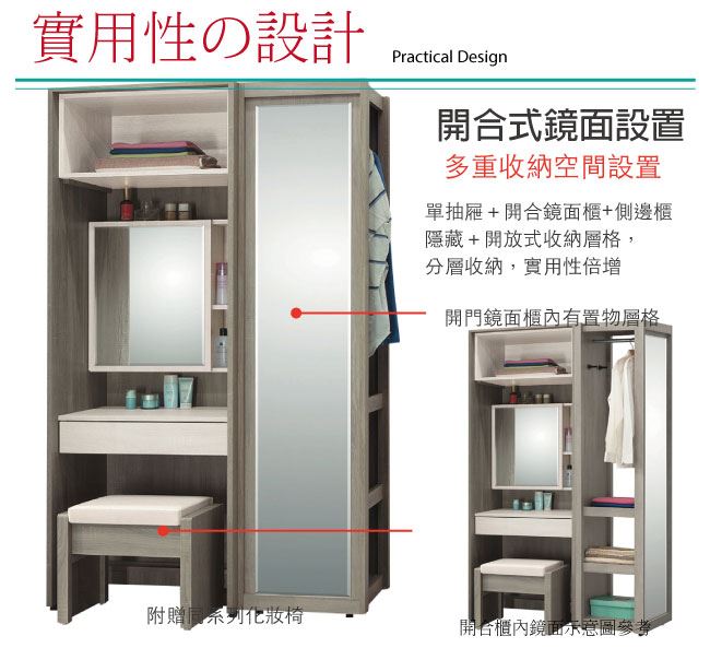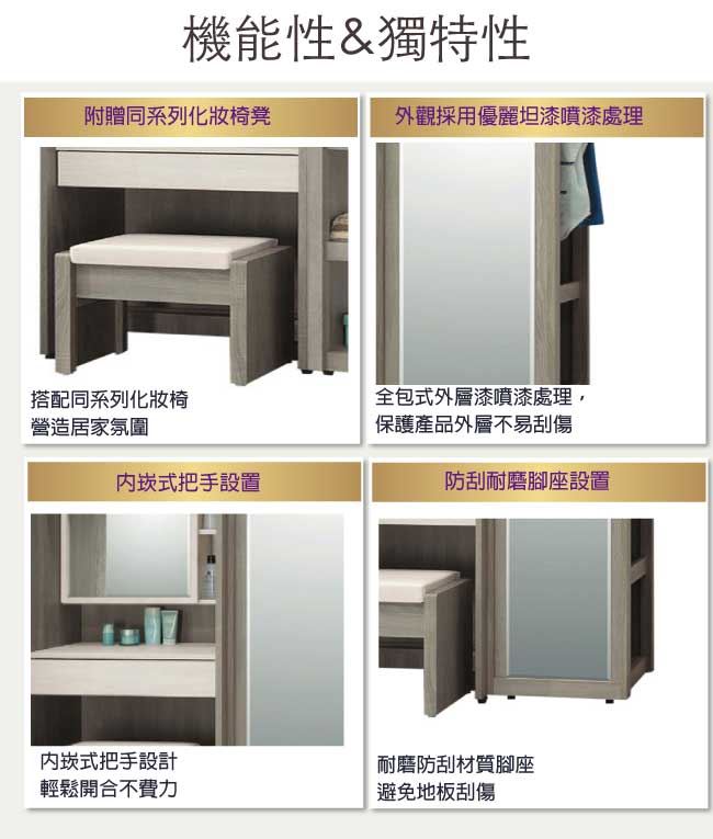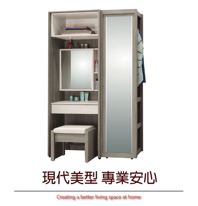 商品介紹 | 【綠家居】歐倫勒 時尚3.3尺雙鏡面鏡台衣櫃/收納櫃組合(含化妝椅+鏡台衣櫃+穿衣鏡面櫃) 橡木紋色系+現代簡約風格+安心材質製造,整體採用防蛀木心板+防潮耐磨腳座+強化玻璃鏡面+五金滑軌結構等安心材質製造,外層採用全包式防潮耐磨噴漆處理搭配採用開合式鏡面櫃+單抽屜+吊衣桿+穿衣鏡面設置+開放式收納層格等收納空間設計,全由專人配送到家,專業安心服務,替你省下更多時間! 【商品特色】 橡木紋色系+現代簡約風格+安心材質製造,使用放心+搭配居家更便利 採用防蛀木心板+防潮耐磨腳座+強化玻璃鏡面+五金滑軌結構等安心材質製造 採用開合式鏡面櫃+單抽屜+吊衣桿+穿衣鏡面設置+開放式收納層格等收納空間設計 此商品不需要DIY組立,此商品為組立後之成品 品質保證、專業設計、貼心服務 全由專人配送到家,專業安心服務,替您省下更多時間 |